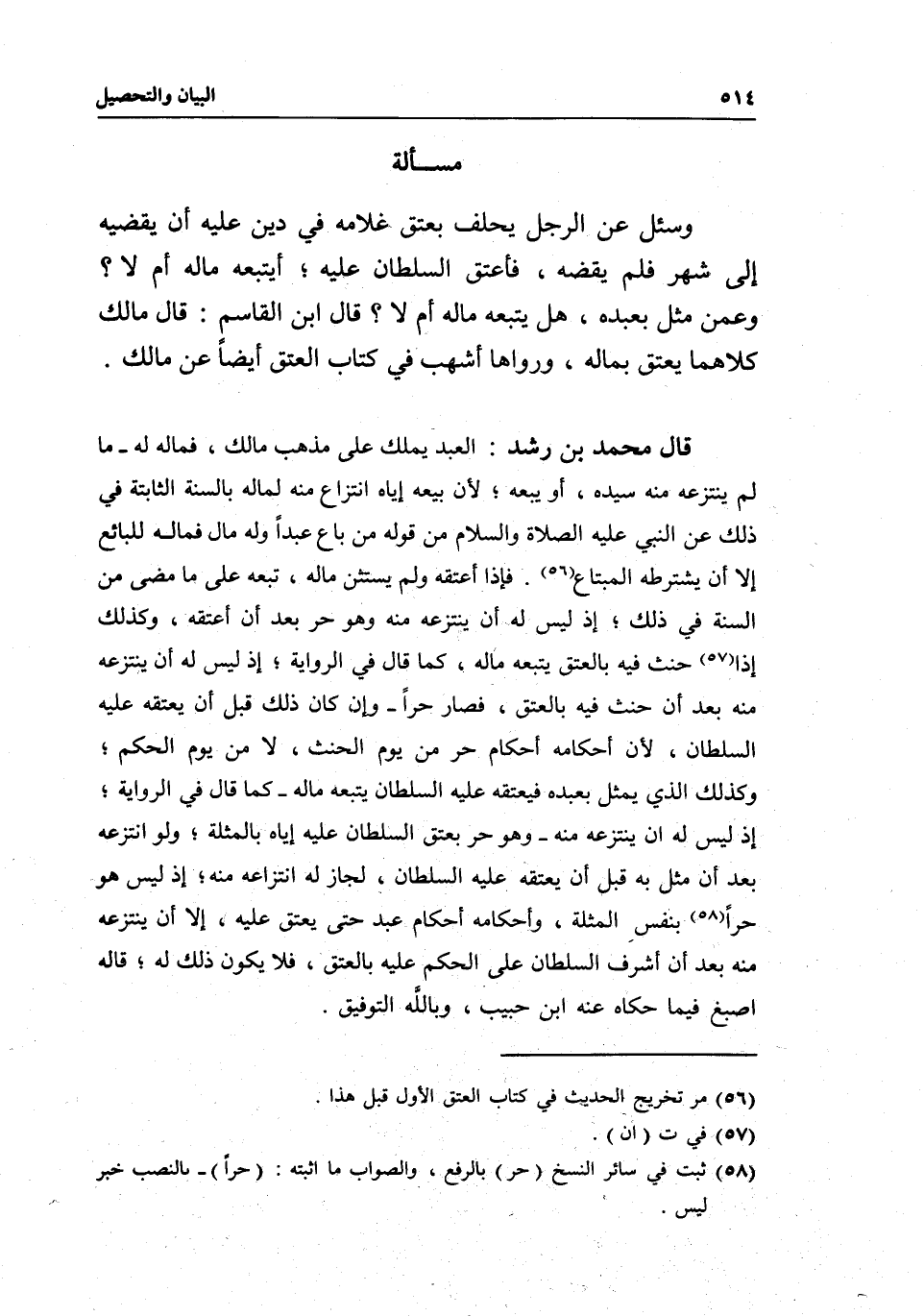 مسألة وسئل عن الرجل يحلف بعتق غلامه في دين عليه أن يقضيه إلى شهر، فلم يقضه، فأعتق السلطان عليه؛ أيتبعه ماله أم لا؟ وعمن مثل بعبده، هل يتبعه ماله أم لا؟ قال ابن القاسم: قال مالك: كلاهما يعتق بماله، ورواها أشهب في كتاب العتق أيضا عن مالك.