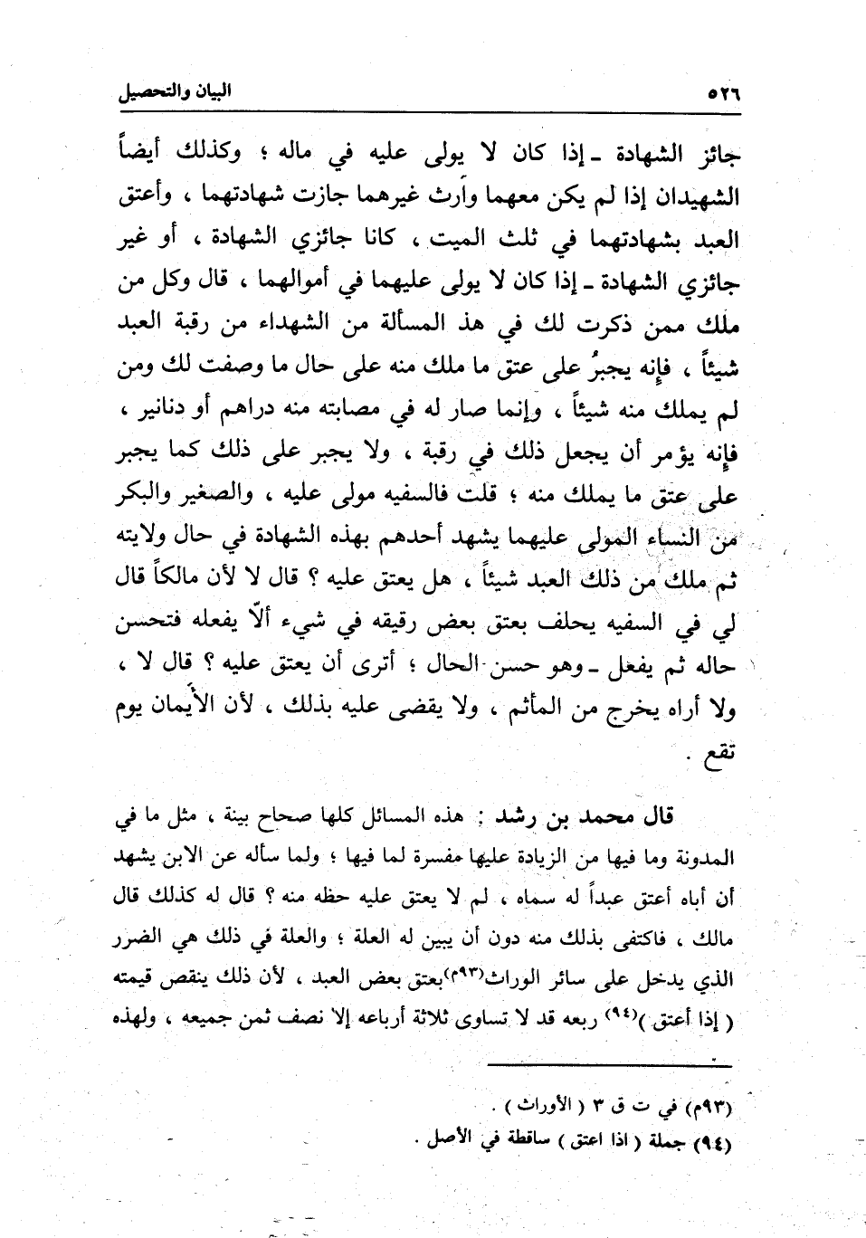 جائز الشهادة، إذا كان لا يولى عليه في ماله؛ وكذلك أيضا الشهيدان إذا لم يكن معهما وارث غيرهما جازت شهادتهما، وأعتق العبد بشهادتهما في ثلث الميت، كانا جائزي الشهادة، أو غير جائزي الشهادة إذا كان لا يولى عليهما في أموالهما، قال: وكل من ملك ممن ذكرت لك في هذه المسألة من الشهداء من رقبة العبد شيئا، فإنه يجبر على عتق ما ملك منه على حال ما وصفت لك، ومن لم يملك منه شيئا، وإنما صار له في مصابته منه دراهم أو دنانير، فإنه يؤمر أن يجعل ذلك في رقبة، ولا يجبر على ذلك كما يجبر على عتق ما يملك منه؛ قلت: فالسفيه مولى عليه، والصغير والبكر من النساء المولى عليهما، يشهد أحدهم بهذه الشهادة في حال ولايته، ثم ملك من ذلك العبد شيئا، هل يعتق عليه؟ قال: لا؛ لأن مالكا قال لي في السفيه يحلف بعتق بعض رقيقه في شيء ألا يفعله، فتحسن حاله، ثم يفعل وهو حسن الحال؛ أترى أن يعتق عليه؟ قال: لا، ولا أراه يخرج من المأثم، ولا يقضى عليه بذلك؛ لأن الأيمان يوم تقع.