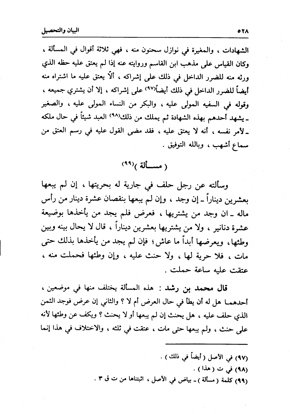 الشهادات، والمغيرة في نوازل سحنون منه، فهي ثلاثة أقوال في المسألة، وكان القياس على مذهب ابن القاسم وروايته عنه إذا لم يعتق عليه حظه الذي ورثه منه للضرر الداخل في ذلك على أشراكه، ألا يعتق عليه ما اشتراه منه أيضا للضرر الداخل في ذلك أيضا على أشراكه، إلا أن يشتري جميعه، وقوله في السفيه المولى عليه، والبكر من النساء المولى عليه، والصغير يشهد أحدهم بهذه الشهادة، ثم يملك من ذلك العبد شيئا في حال ملكه لأمر نفسه، أنه لا يعتق عليه، فقد مضى القول عليه في رسم العتق، من سماع أشهب، وبالله التوفيق.