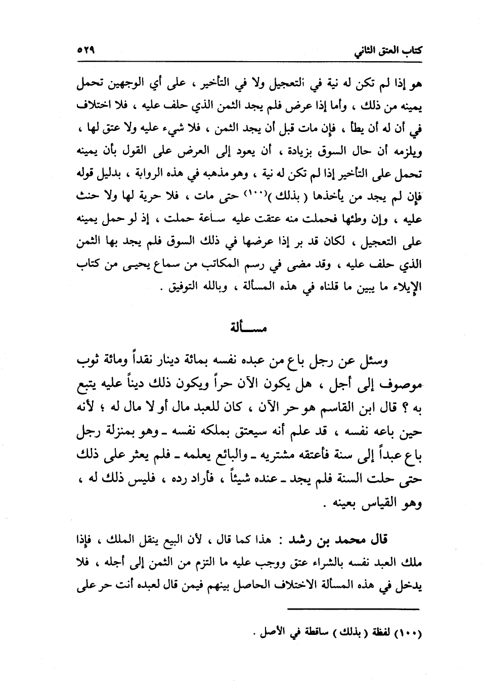 مسألة وسئل عن رجل باع من عبده نفسه بمائة دينار نقدا، ومائة ثوب موصوف إلى أجل، هل يكون الآن حرا، ويكون ذلك دينا عليه يتبع به؟ قال ابن القاسم: هو حر الآن، كان للعبد مال أو لا مال له؛ لأنه حين باعه نفسه، قد علم أنه سيعتق بملكه نفسه وهو بمنزلة رجل باع عبدا إلى سنة فأعتقه مشتريه، والبائع يعلمه فلم يعثر على ذلك حتى حلت السنة، فلم يجد عنده شيئا، فأراد رده، فليس ذلك له، وهو القياس بعينه.