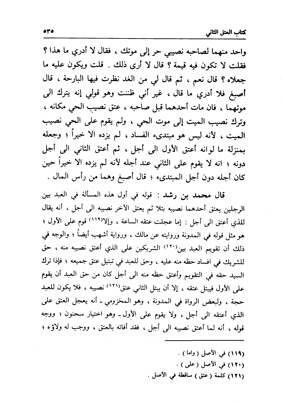 واحد منهما لصاحبه نصيبي حر إلى موتك، فقال: لا أدري ما هذا؟ فقلت: لا تكون فيه قيمة؟ قال: لا أرى ذلك، قلت: ويكون عليه ما جعلاه؟ قال: نعم، ثم قال لي من الغد نظرت فيها البارحة، قال أصبغ: فلا أدري ما قال، غير أني ظننت، وهو قولي: إنه يترك إلى موتهما، فإن مات أحدهما قبل صاحبه، عتق نصيب الحي مكانه، وترك نصيب الميت إلى موت الحي، ولم يقوم على الحي نصيب الميت؛ لأنه ليس هو مبتدئ الفساد، لم يزده إلا خيرا؛ وجعله بمنزلة ما لو أنه أعتق الأول إلى أجل، ثم أعتق الثاني إلى أجل دونه؛ أنه لا يقوم على الثاني عند أجله؛ لأنه لم يزده إلا خيرا حين كان أجله دون أجل المبتدئ؛ قال أصبغ: وهما من رأس المال.
