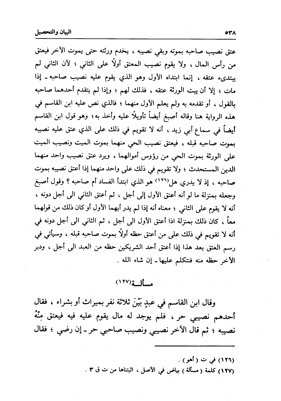 ولا تقويم في ذلك على واحد منهما إذا أعتق نصيبه بموت صاحبه؛ إذ لا يدري هل هو الذي ابتدأ الفساد أم صاحبه؟ وقول أصبغ وجعله بمنزلة ما لو أنه أعتق الأول إلى أجل، ثم أعتق الثاني إلى أجل دونه، أنه لا يقوم على الثاني؛ معناه أنه إذا لم يدر أيهما الأول، أو كان ذلك من قولهما معا، كان ذلك بمنزلة إذا أعتق الأول إلى أجل، ثم الثاني إلى أجل دونه في أنه لا تقويم في ذلك على من أعتق حظه أولا بموت صاحبه قبله، وسيأتي في رسم العتق بعد هذا إذا أعتق أحد الشريكين حظه من العبد إلى أجل، ودبر الآخر حظه منه، فنتكلم عليها إن شاء الله.