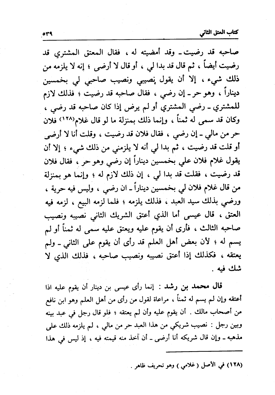 صاحبه: قد رضيت وقد أمضيته له، فقال المعتق المشتري: قد رضيت أيضا، ثم قال: قد بدا لي، أو قال: لا أرضى؛ أنه لا يلزمه من ذلك شيء، إلا أن يقول: نصيبي ونصيب صاحبي لي بخمسين دينارا، وهو حر إن رضي، فقال صاحبه: قد رضيت؛ فذلك لازم للمشتري رضي المشتري أو لم يرض إذا كان صاحبه قد رضي، وكان قد سمى له ثمنا، وإنما ذلك بمنزلة ما لو قال: غلام فلان حر من مالي إن رضي، فقال فلان: قد رضيت، وقلت أنا: لا أرضى، أو قلت: قد رضيت، ثم بدا لي أنه لا يلزمني من ذلك شيء، إلا أن يقول غلام فلان علي بخمسين دينارا إن رضي وهو حر، فقال فلان: قد رضيت، فقلت: قد بدا لي، إن ذلك لازم له؛ وإنما هو بمنزلة من قال: غلام فلان لي بخمسين دينارا إن رضي، وليس فيه حرية، ورضي بذلك سيد العبد، فذلك يلزمه؛ فلما لزمه البيع، لزمه فيه العتق، قال عيسى: أما الذي أعتق الشريك الثاني نصيبه ونصيب صاحبه الثالث، فأرى أن يقوم عليه ويعتق عليه سمى له ثمنا أو لم يسم له؛ لأن بعض أهل العلم قد رأى أن يقوم على الثاني ولم يعتقه، فكذلك إذا أعتق نصيبه ونصيب صاحبه، فذلك الذي لا شك فيه.