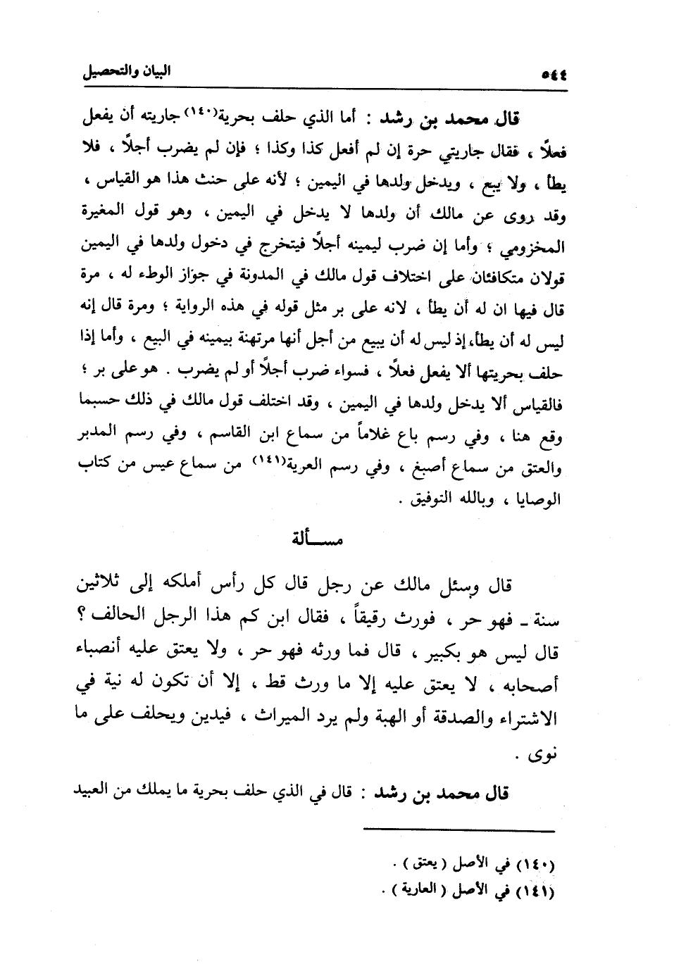 قال محمد بن رشد: أما الذي حلف بحرية جاريته أن يفعل فعلا، فقال: جاريتي حرة إن لم أفعل كذا وكذا؛ فإن لم يضرب أجلا، فلا يطأ، ولا يبع، ويدخل ولدها في اليمين؛ لأنه على حنث هذا هو القياس، وقد روى عن مالك أن ولدها لا يدخل في اليمين، وهو قول المغيرة المخزومي؛ وأما إن ضرب ليمينه أجلا، فيتخرج في دخول ولدها في اليمين قولان متكافئان على اختلاف قول مالك في المدونة في جواز الوطء له، مرة قال فيها: إن له أن يطأ؛ لأنه على بر مثل قوله في هذه الرواية؟ ومرة قال: إنه ليس له أن يطأ؛ إذ ليس له أن يبيع من أجل أنها مرتهنة بيمينه في البيع، وأما إذا حلف بحريتها ألا يفعل فعلا، فسواء ضرب أجلا أو لم يضرب، هو على بر؛ فالقياس ألا يدخل ولدها في اليمين، وقد اختلف قول مالك في ذلك حسبما وقع هنا، وفي رسم باع غلاما من سماع ابن القاسم، وفي رسم المدبر والعتق من سماع أصبغ، وفي رسم العرية من سماع عيسى، من كتاب الوصايا، وبالله التوفيق.