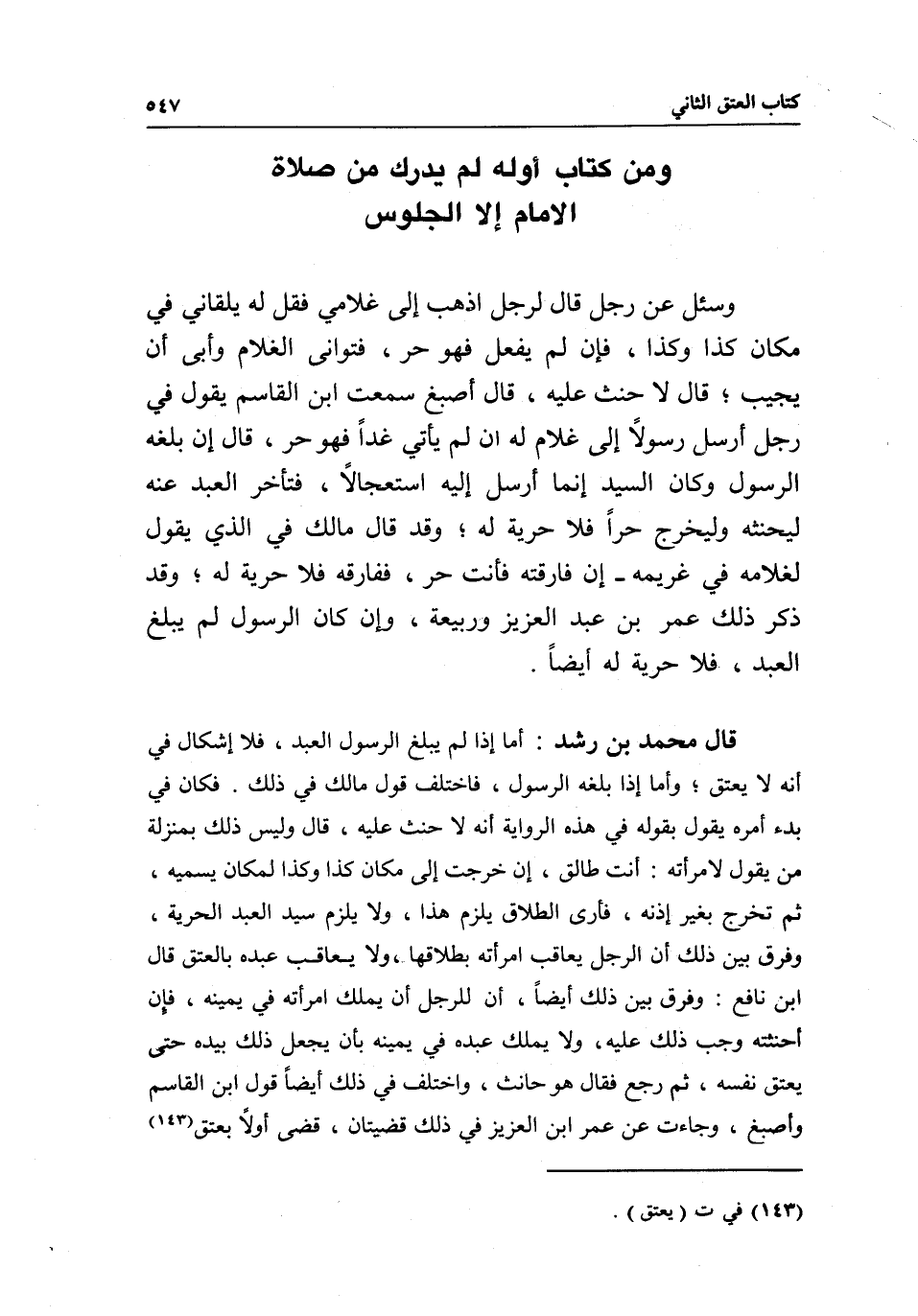 الإمام إلا الجلوس وسئل عن رجل قال لرجل: اذهب إلى غلامي فقل له يلقاني في مكان كذا وكذا، فإن لم يفعل فهو حر، فتوانى الغلام، وأبى أن يجيب؛ قال: لا حنث عليه، قال أصبغ: سمعت ابن القاسم يقول في رجل أرسل رسولا إلى غلام له إن لم يأت غدا فهو حر، قال: إن بلغه الرسول، وكان السيد إنما أرسل إليه استعجالا، فتأخر العبد عنه ليحنثه، وليخرج حرا، فلا حرية له؛ وقد قال مالك في الذي يقول لغلامه في غريمه: إن فارقته فأنت حر، ففارقه فلا حرية له؛ وقد ذكر ذلك عمر بن عبد العزيز وربيعة، وإن كان الرسول لم يبلغ العبد، فلا حرية له أيضا.