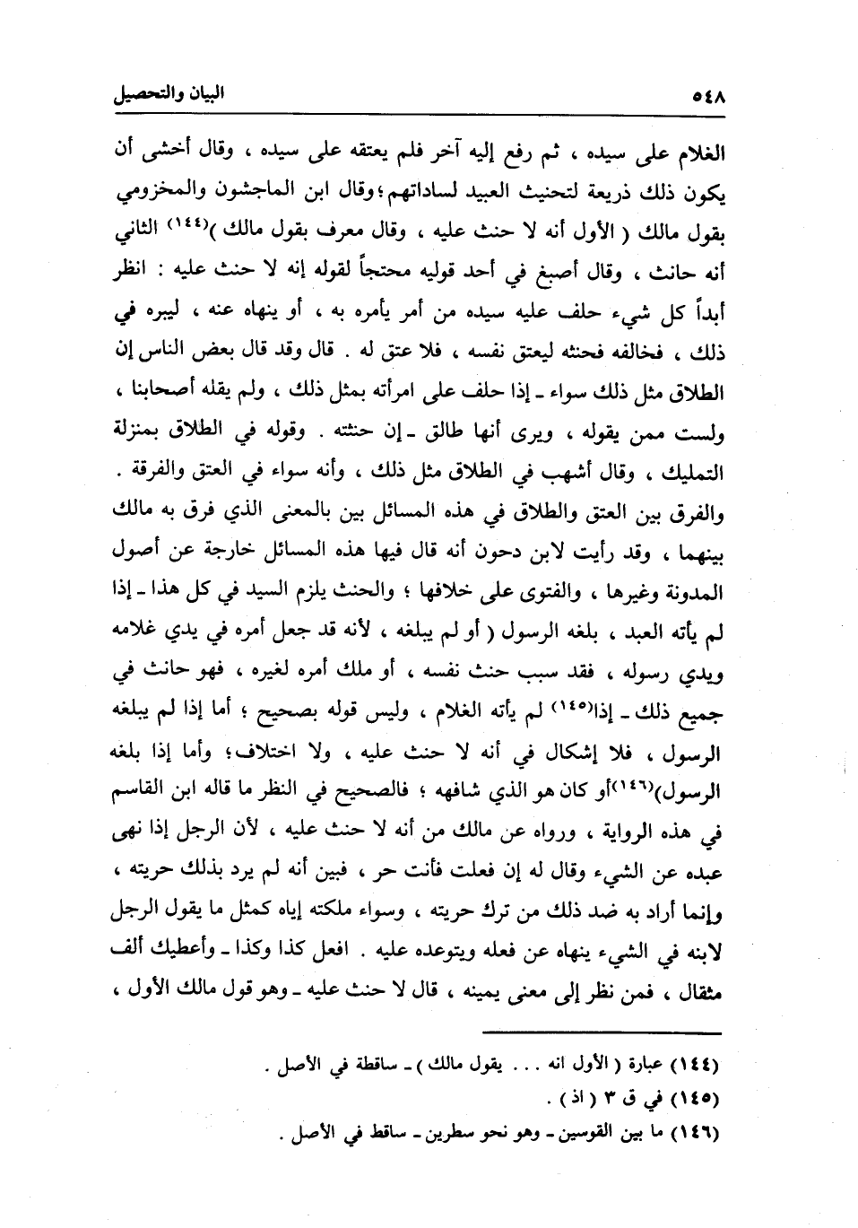 والفرق بين العتق والطلاق في هذه المسائل بين بالمعنى الذي فرق به مالك بينهما، وقد رأيت لابن دحون أنه قال فيها هذه المسائل خارجة عن أصول المدونة وغيرها، والفتوى على خلافها، والحنث يلزم السيد في كل هذا إذا لم يأته العبد، بلغه الرسول أو لم يبلغه؛ لأنه قد جعل أمره في يدي غلامه ويدي رسوله، فقد سبب حنث نفسه، أو ملك أمره لغيره، فهو حانث في جميع ذلك إذا لم يأته الغلام، وليس قوله بصحيح؛ أما إذا لم يبلغه الرسول، فلا إشكال في أنه لا حنث عليه، ولا اختلاف؛ وأما إذا بلغه الرسول، أو كان هو الذي شافهه؛ فالصحيح في النظر ما قاله ابن القاسم في هذه الرواية، ورواه عن مالك من أنه لا حنث عليه؛ لأن الرجل إذا نهى عبده عن الشيء، وقال له: إن فعلت فأنت حر، فبين أنه لم يرد بذلك حريته، وإنما أراد به ضد ذلك من ترك حريته، وسواء ملكته إياه كمثل ما يقول الرجل لابنه في الشيء ينهاه عن فعله ويتوعده عليه. افعل كذا وكذا وأعطيك ألف مثقال، فمن نظر إلى معنى يمينه، قال: لا حنث عليه، وهو قول مالك الأول،