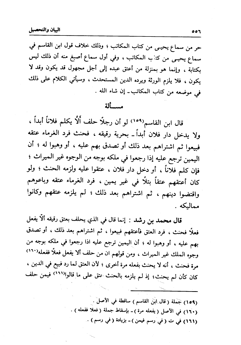 قال محمد بن رشد: إنما قال في الذي يحلف بعتق رقيقه ألا يفعل فعلا فحنث، فرد العتق فأعتقهم فبيعوا، ثم اشتراهم بعد ذلك، أو تصدق بهم عليه، أو وهبوا له؛ أن اليمين ترجع عليه إذا رجعوا في ملكه بوجه من وجوه الملك غير الميراث، ومن قولهم: إن من حلف ألا يفعل فعلا، ففعله مرة فحنث، أنه لا يحنث بفعله مرة أخرى؛ لأن العتق لما رد فبيع في الدين، كان كأن لم يحنث؛ إذ لم يلزمه بالحنث عتق على ما قالوا فيمن حلف