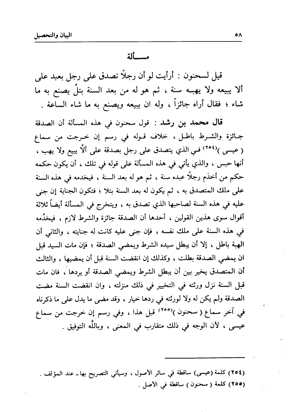 مسألة قيل لسحنون: أرأيت لو أن رجلا تصدق على رجل بعبد، على ألا يبيعه ولا يهبه سنة، ثم هو له من بعد السنة بتل يصنع به ما شاء، فقال: أراه جائزا، وله أن يبيعه ويصنع به ما شاء الساعة.