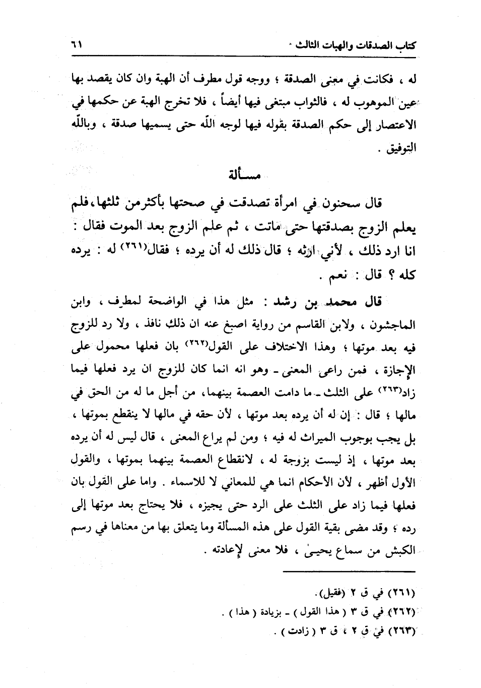 قال محمد بن رشد: مثل هذا في الواضحة لمطرف، وابن الماجشون، ولابن القاسم من رواية أصبغ عنه أن ذلك نافذ، ولا رد للزوج فيه بعد موتها؛ وهذا الاختلاف على القول بأن فعلها محمول على الإجازة، فمن راعى المعنى، وهو أنه إنما كان للزوج أن يرد فعلها فيما زاد على الثلث، ما دامت العصمة بينهما، من أجل ما له من الحق في مالها.