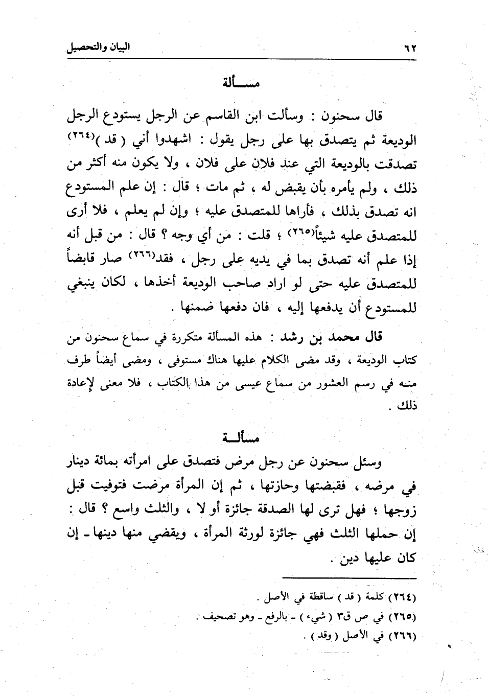 قال محمد بن رشد: هذه المسألة متكررة في سماع سحنون من كتاب الوديعة، وقد مضى الكلام عليها هناك مستوفى، ومضى أيضا طرف منه في رسم العشور، من سماع عيسى، من هذا الكتاب، فلا معنى لإعادة ذلك.