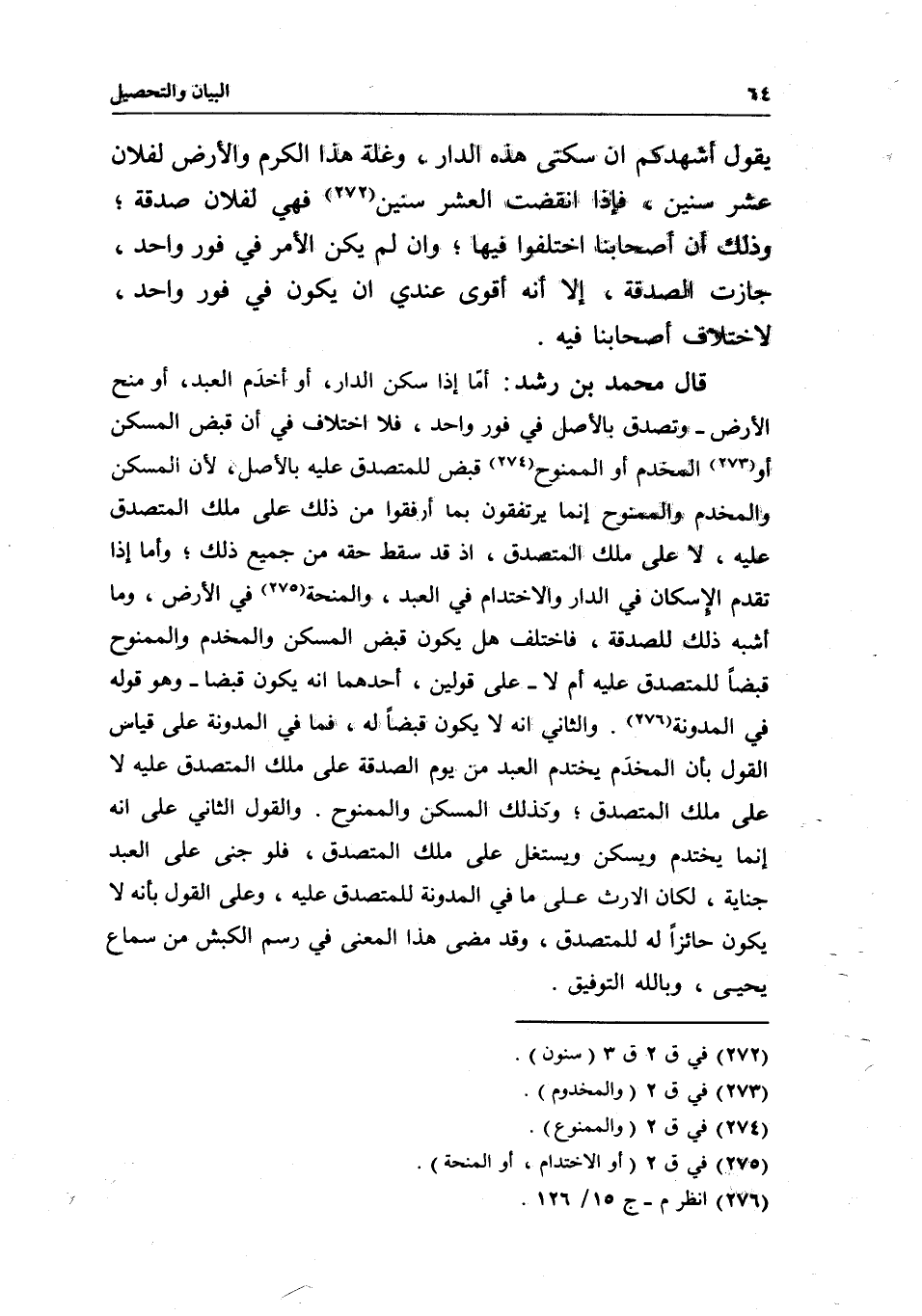 قال محمد بن رشد: أما إذا سكن الدار، أو أخدم العبد، أو منح الأرض، وتصدق بالأصل في فور واحد، فلا اختلاف في أن قبض المسكن أو المخدم أو الممنوح قبض للمتصدق عليه بالأصل؛ لأن المسكن والمخدم والممنوح إنما يرتفقون بما أرفقوا من ذلك على ملك المتصدق عليه، لا على ملك المتصدق؛ إذ قد سقط حقه من جميع ذلك؛ وأما إذا تقدم الإسكان في الدار والاختدام في العبد، والمنحة في الأرض، وما أشبه ذلك للصدقة، فاختلف هل يكون قبض المسكن والمخدم والممنوح قبضا للمتصدق عليه أم لا؟ على قولين؛ أحدهما: أنه يكون قبضا، وهو قوله في المدونة. والثاني: أنه لا يكون قبضا له، فما في المدونة على قياس القول بأن المخدم يختدم العبد من يوم الصدقة على ملك المتصدق عليه لا على ملك المتصدق؛ وكذلك المسكن والممنوح.