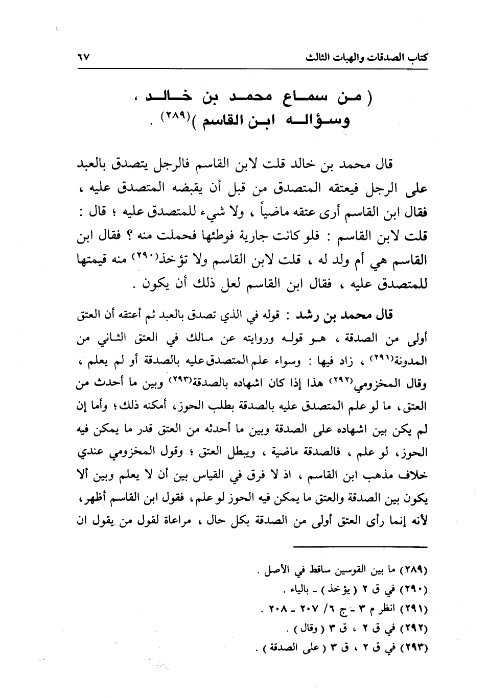 وسؤاله ابن القاسم. قال محمد بن خالد: قلت لابن القاسم، فالرجل يتصدق بالعبد على الرجل فيعتقه المتصدق من قبل أن يقبضه المتصدق عليه، فقال ابن القاسم: أرى عتقه ماضيا، ولا شيء للمتصدق عليه؛ قال: قلت لابن القاسم: فلو كانت جارية فوطئها فحملت منه؟ فقال ابن القاسم: هي أم ولد له، قلت لابن القاسم: ولا تؤخذ منه قيمتها للمتصدق عليه، فقال ابن القاسم: لعل ذلك أن يكون.