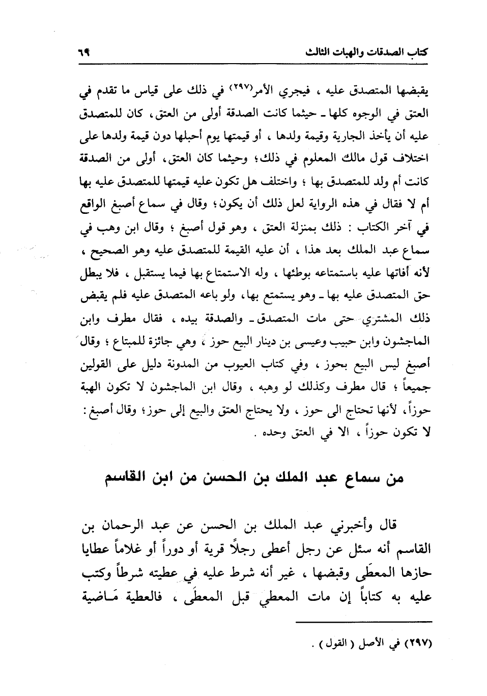من سماع عبد الملك بن الحسن من ابن القاسم قال: وأخبرني عبد الملك بن الحسن، عن عبد الرحمن بن القاسم أنه سئل عن رجل أعطى رجلا قرية أو دورا أو غلاما عطايا، حازها المعطى وقبضها، غير أنه شرط عليه في عطيته شرطا، وكتب عليه به كتابا إن مات المعطي قبل المعطى، فالعطية ماضية