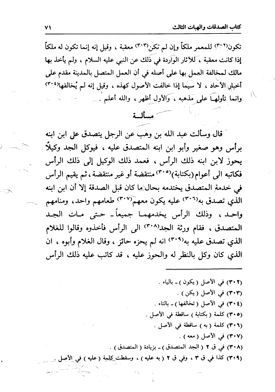 مسألة قال: وسألت عبد الله بن وهب عن الرجل يتصدق على ابن ابنه برأس، وهو صغير، وأبو ابن ابنه المتصدق عليه، فيوكل الجد وكيلا يحوز لابن ابنه ذلك الرأس، فعمد ذلك الوكيل إلى ذلك الرأس فكاتبه إلى أعوام بكتابة منتقضة أو غير منتقضة، ثم يقيم الرأس في خدمة المتصدق يختدمه بحال ما كان قبل الصدقة إلا أن ابن ابنه الذي تصدق به عليه يكون معهم طعامهم واحد، ومنامهم واحد، وذلك الرأس يخدمهما جميعا حتى مات الجد المتصدق، فقام ورثة الجد إلى الرأس، فأخذوه وقالوا: للغلام الذي تصدق عليه به أنه لم يحزه حائز، وقال الغلام وأبوه إن الذي كان وكل بالنظر له والحوز عليه، قد كاتب عليه ذلك الرأس،