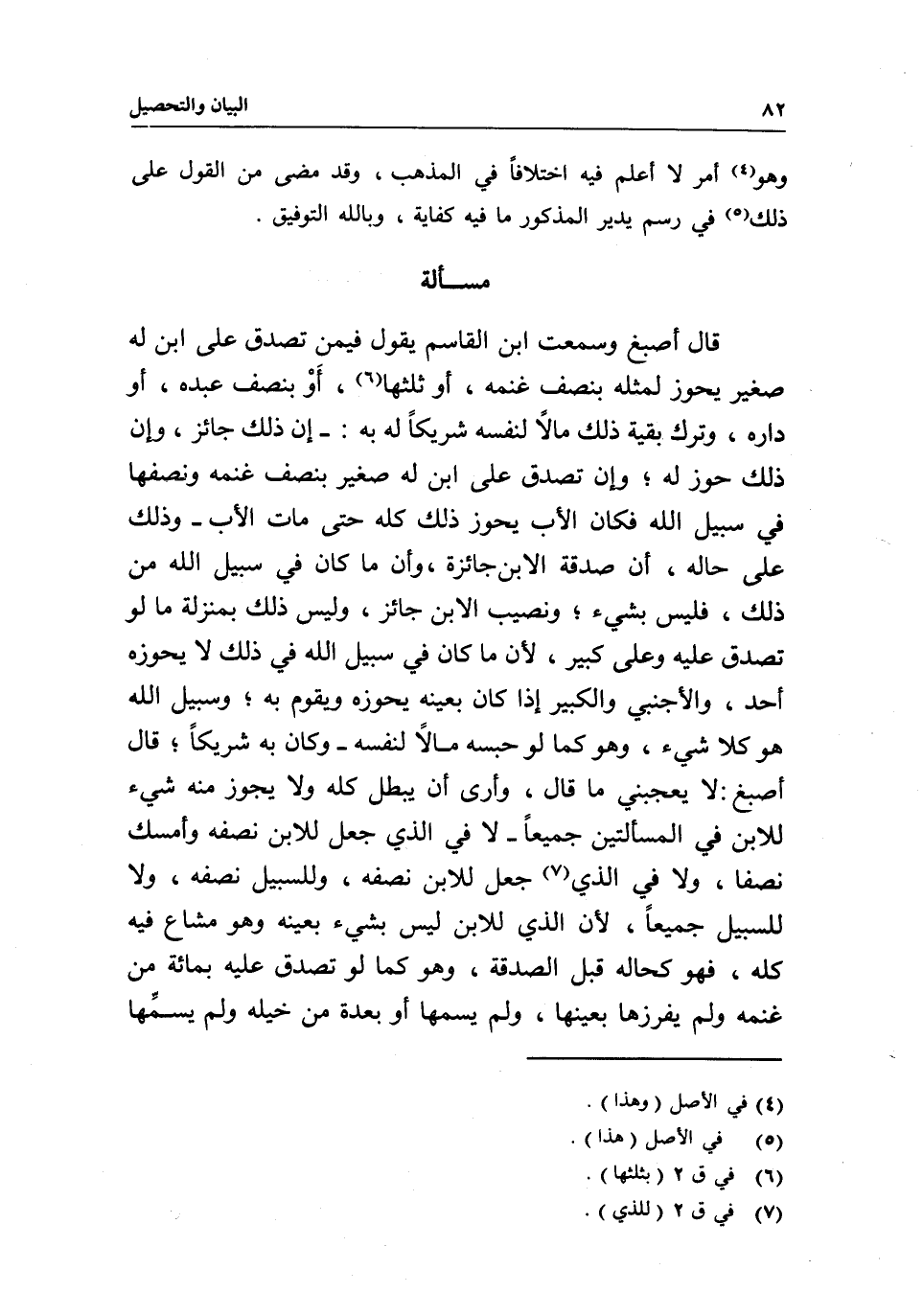 قال أصبغ: لا يعجبني ما قال، وأرى أن يبطل كله، ولا يجوز منه شيء للابن في المسألتين جميعا، لا في الذي جعل للابن نصفه، وأمسك نصفا، ولا في الذي جعل للابن نصفه، وللسبيل نصفه، ولا للسبيل جميعا؛ لأن الذي للابن ليس بشيء بعينه، وهو مشاع فيه كله، فهو كحاله قبل الصدقة، وهو كما لو تصدق عليه بمائة من غنمه ولم يفرزها بعينها، ولم يسمها أو بعدة من خيله، ولم يسمها