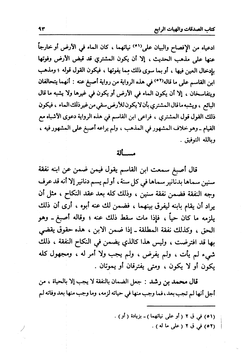 مسألة قال أصبغ: سمعت ابن القاسم يقول فيمن ضمن عن ابنه نفقة سنين سماها، بدنانير سماها في كل سنة، أو لم يسم دنانير، إلا أنه قد عرف وجه النفقة، فضمن نفقة سنين، وذلك كله بعد عقد النكاح، مثل أن يراد أن يقام بابنه ليفرق بينهما، فضمن لك عنه أبوه، أرى أن ذلك يلزمه ما كان حيا، فإذا مات سقط ذلك عنه؛ وقاله أصبغ، وهو الحق، وكذلك نفقة المطلقة إذا ضمن الابن، هذه حقوق يقضى بها قد افترضت، وليس هذا كالذي يضمن في النكاح النفقة، ذلك شيء لم يأت، ولم يفرض، ولم يجب ولا أمر له، ومجهول كله يكون أو لا يكون، ومتى يفترقان أو يموتان.