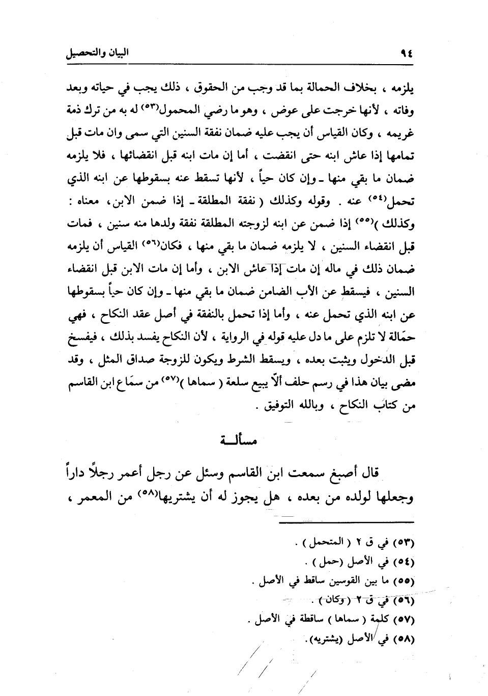 يلزمه، بخلاف الحمالة بما قد وجب من الحقوق، ذلك يجب في حياته وبعد وفاته؛ لأنها خرجت على عوض، وهو ما رضي المحمول له به من ترك ذمة غريمه، وكان القياس أن يجب عليه ضمان نفقة السنين التي سمى، وإن مات قبل تمامها إذا عاش ابنه حتى انقضت، أما إن مات ابنه قبل انقضائها، فلا يلزمه ضمان ما بقي منها وإن كان حيا؛ لأنها تسقط عنه بسقوطها عن ابنه الذي تحمل عنه.