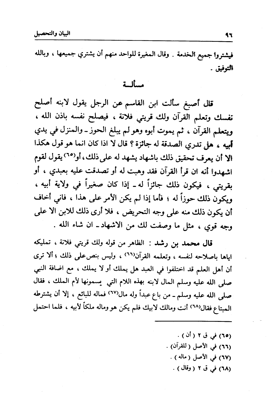 قال محمد بن رشد: الظاهر من قوله: ولك قريتي فلانة، تمليكه إياها بإصلاحه لنفسه، وتعلمه القرآن، وليس بنص على ذلك؛ ألا ترى أن أهل العلم قد اختلفوا في العبد هل يملك أو لا يملك، مع إضافة النبي - صَلَّى اللَّهُ عَلَيْهِ وَسَلَّمَ - المال لابنه بهذه اللام التي يسمونها لام الملك، فقال - صَلَّى اللَّهُ عَلَيْهِ وَسَلَّمَ -: «من باع عبدا وله مال، فماله للبائع، إلا أن يشترطه المبتاع؛» فقال: «أنت ومالك لأبيك» فلم يكن هو وماله ملكا لأبيه، فلما احتمل