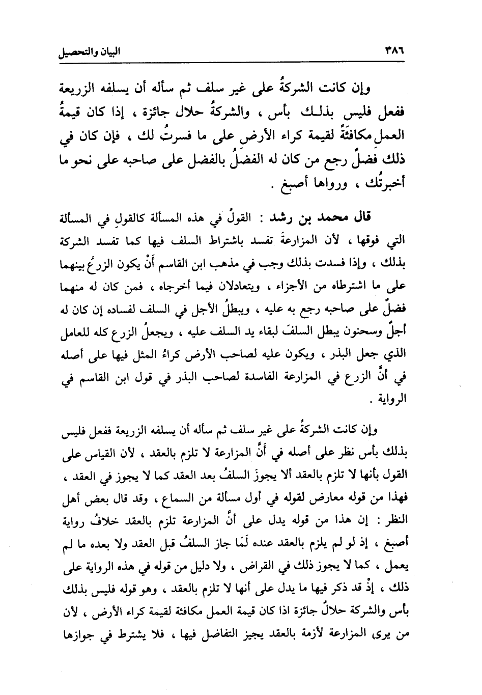 وإن كانت الشركة على غير سلف ثم سأله أن يسلفه الزريعة ففعل فليس بذلك بأس نظر على أصله في أن المزارعة لا تلزم بالعقد، لأن القياس على القول بأنها لا تلزم بالعقد ألا يجوز السلف بعد العقد كما لا يجوز في العقد، فهذا من قوله معارض لقوله في أول مسألة من السماع، وقد قال بعض أهل النظر: إن هذا من قوله يدل على أن المزارعة تلزم بالعقد خلاف رواية أصبغ، إذ لو لم يلزم بالعقد عنده لما جاز السلف قبل العقد ولا بعده ما لم يعمل، كما لا يجوز ذلك في القراض، ولا دليل من قوله في هذه الرواية على ذلك، إذ قد ذكر فيها ما يدل على أنها لا تلزم بالعقد، وهو قوله فليس بذلك بأس، والشركة حلال جائزة إذا كان قيمة العمل مكافئة لقيمة كراء الأرض، لأن من يرى المزارعة لأزمة بالعقد يجيز التفاضل فيها، فلا يشترط في جوازها