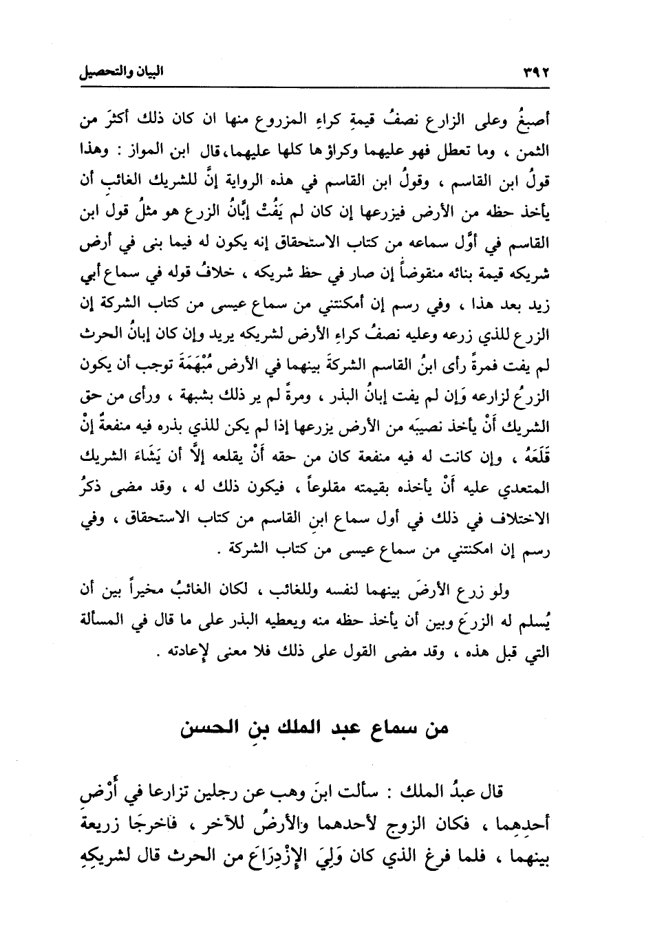 من سماع عبد الملك بن الحسن قال عبد الملك: سألت ابن وهب عن رجلين تزارعا في أرض أحدهما، فكان الزوج لأحدهما والأرض للآخر، فاخرجا زريعة بينهما، فلما فرغ الذي كان ولي الازدراع من الحرث قال لشريكه
