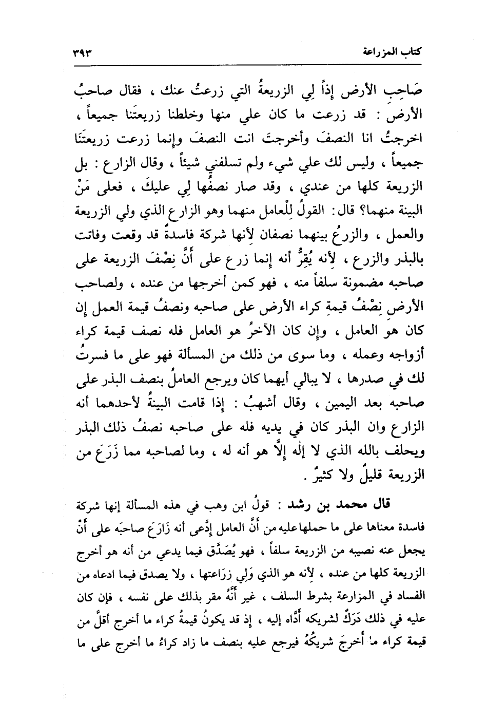 قال محمد بن رشد: قول ابن وهب في هذه المسألة إنها شركة فاسدة معناها على ما حملها عليه من أن العامل ادعى أنه زارع صاحبه على أن يجعل عنه نصيبه من الزريعة سلفًا، فهو يصدق فيما يدعي من أنه هو أخرج الزريعة كلها من عنده، لأنه هو الذي ولي زراعتها، ولا يصدق فيما ادعاه من الفساد في المزارعة بشرط السلف، غير أنه مقر بذلك على نفسه، فإن كان عليه في ذلك درك لشريكه أداه إليه، إذ قد يكون قيمة كراء ما أخرج أقل من قيمة كراء ما أخرج شريكه فيرجع عليه بنصف ما زاد كراء ما أخرج على ما