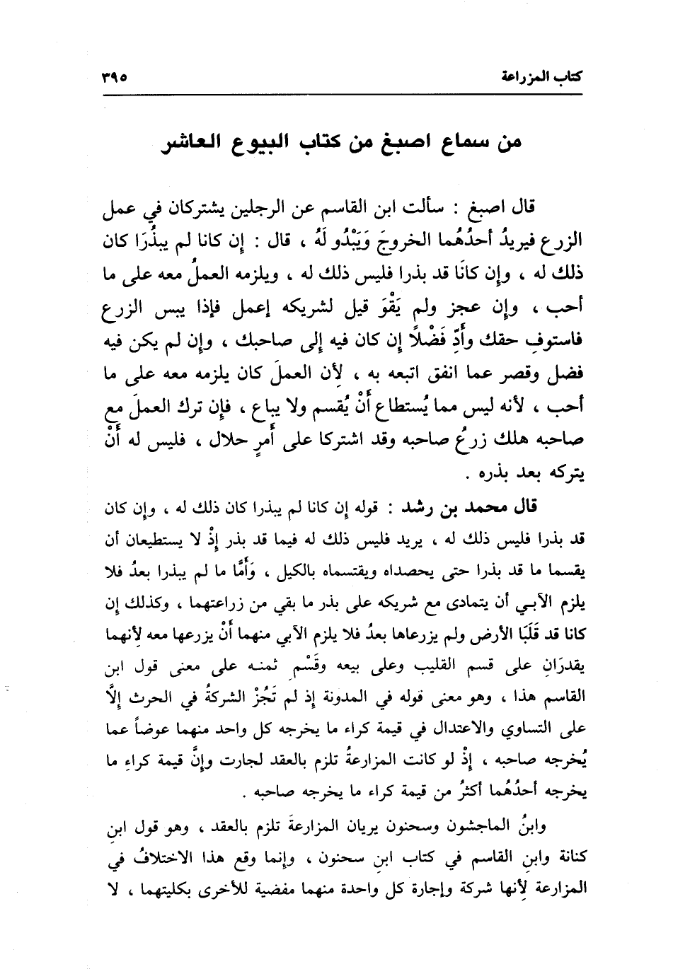 من سماع أصبغ من كتاب البيوع العاشر قال أصبغ: سألت ابن القاسم عن الرجلين يشتركان في عمل الزرع فيريد أحدهما الخروج ويبدو له، قال: إن كانا لم يبذرا كان ذلك له، وإن كانا قد بذرا فليس ذلك له، ويلزمه العمل معه على ما أحب، وإن عجز ولم يقو قيل لشريكه اعمل فإذا يبس الزرع فاستوف حقك واد فضلا إن كان فيه إلى صاحبك، وإن لم يكن فيه فضل وقصر عما انفق اتبعه به، لأن العمل كان يلزمه معه على ما أحب، لأنه ليس مما يستطاع أن يقسم ولا يباع، فإن ترك العمل مع صاحبه هلك زرع صاحبه وقد اشتركا على أمر حلال، فليس له أن يتركه بعد بذره.