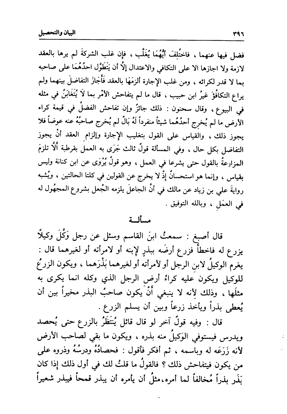 فضل فيها عنهما، فاختلف أيهما يغلب، فإن غلب الشركة لم يرها بالعقد لازمة ولا أجازها إلا على التكافي والاعتدال إلا أن يتطول أحدهما على صاحبه بما لا قدر لكرائه، ومن غلب الإجارة ألزمها بالعقد فأجاز التفاضل بينهما، ولم يراع التكافؤ غير ابن حبيب، قال ما لم يتفاحش الأمر بما لا يتغابن في مثله في البيوع، وقال سحنون: ذلك جائز وإن تفاحش الفضل في قيمة كراء الأرض ما لم يخرج أحدهما شيئا منفردا له بال لم يخرج صاحبه عنه عوضا فلا يجوز ذلك، والقياس على القول بتغليب الإجارة وإلزام العقد أن يجوز التفاضل بكل حال، وفي المسألة قول ثالث جرى به العمل بقرطبة ألا تلزم المزارعة بالقول حتى يشرعا في العمل، وهو قول يروى عن ابن كنانة، وليس بقياس، وإنما هو استحسان إذ لا يخرج عن القولين في كلتا الحالتين، ويشبه رواية علي بن زياد عن مالك في أن الجاعل يلزمه الجعل بشروع المجهول له في العمل، وبالله التوفيق.