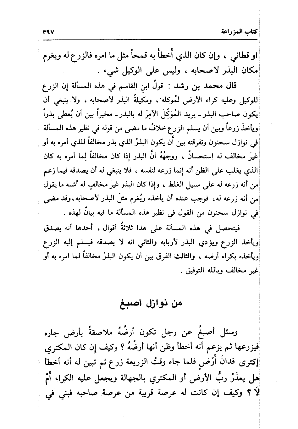 من نوازل أصبغ وسئل أصبغ عن رجل تكون أرضه ملاصقة بأرض جاره فيزرعها ثم يزعم أنه أخطأ وظن أنها أرضه؟ وكيف إن كان المكتري اكترى فدانَ أرضٍ فلما جاء وقت الزريعة زرع ثم تبين له أنه أخطأ هل يعذر رب الأرض أو المكتري بالجهالة، ويجعل عليه الكراء أم لا؟ وكيف إن كانت له عرصة قريبة من عرصة صاحبه فبني في