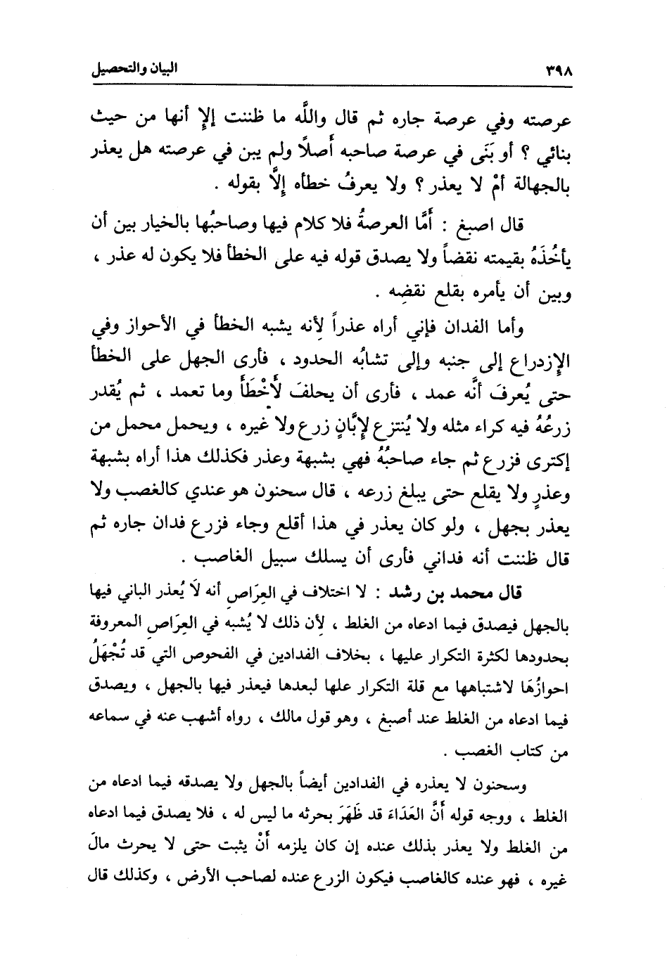قال محمد بن رشد: لا اختلاف في العراص أنه لا يعذر الباني فيها بالجهل فيصدق فيما ادعاه من الغلط، لأن ذلك لا يشبه في العراص المعروفة بحدودها لكثرة التكرار عليها، بخلاف الفدادين في الفحوص التي قد تجهل أحوازها لاشتباهها مع قلة التكرار عليها لبعدها فيعذر فيها بالجهل، ويصدق فيما ادعاه من الغلط عند أصبغ، وهو قول مالك، رواه أشهب عنه في سماعه من كتاب الغصب.