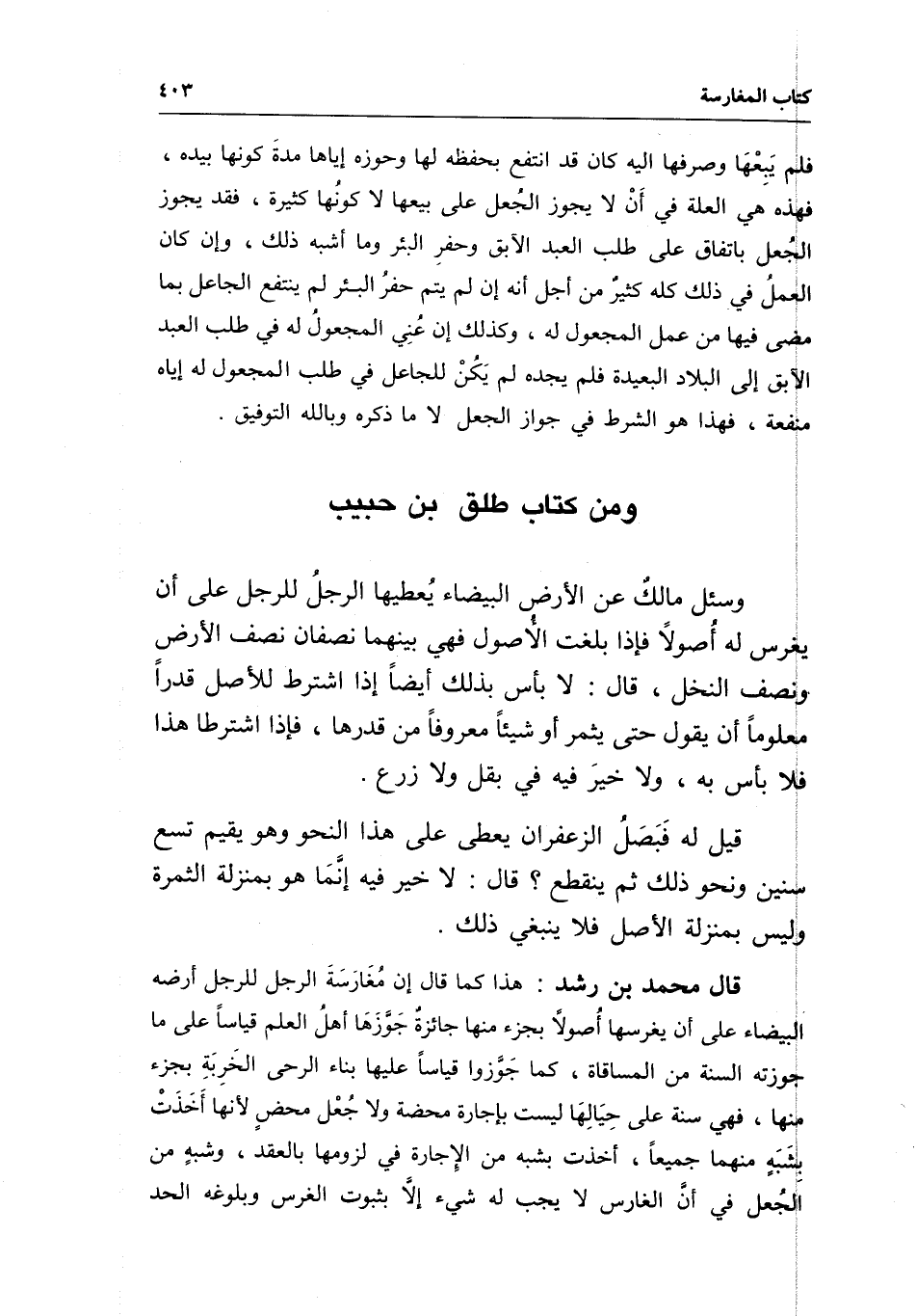 ومن كتاب طلق بن حبيب وسئل مالك عن الأرض البيضاء يعطيها الرجل للرجل على أن يغرس له أصولا، فإذا بلغت الأصول فهي بينهما نصفان نصف الأرض، ونصف النخل، قال: لا بأس بذلك أيضا إذا اشترط للأصل قدرا معلوما أن يقول حتى يثمر أو شيئا معروفا من قدرها، فإذا اشترطا هذا فلا بأس به، ولا خير فيه في بقل ولا زرع.
