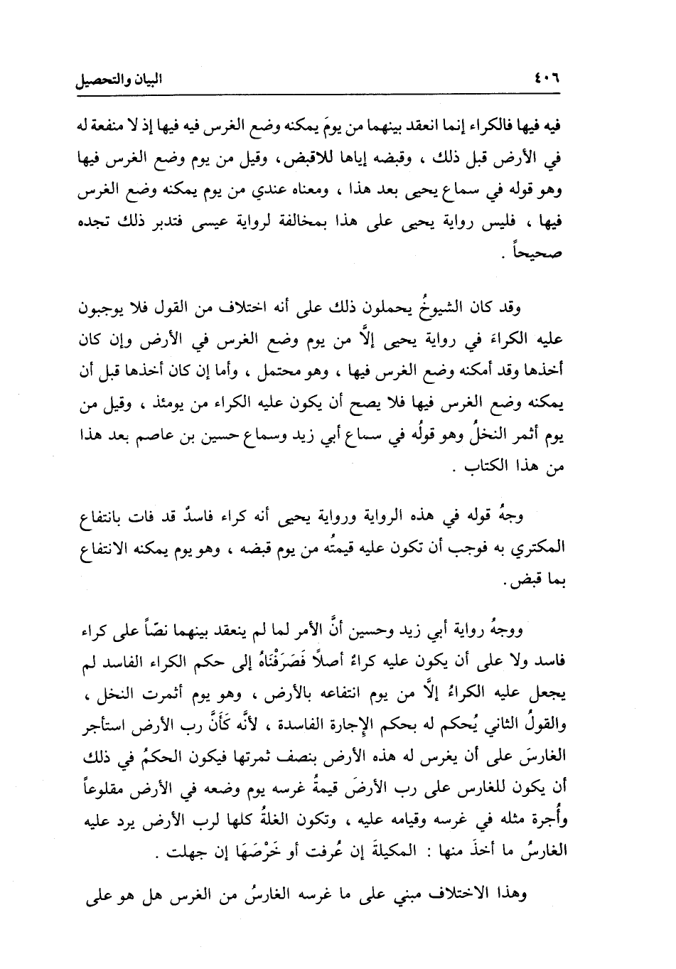 وقد كان الشيوخ يحملون ذلك على أنه اختلاف من القول فلا يوجبون عليه الكراء في رواية يحيى إلا من يوم وضع الغرس في الأرض، وإن كان أخذها، وقد أمكنه وضع الغرس فيها، وهو محتمل، وأما إن كان أخذها قبل أن يمكنه وضع الغرس فيها فلا يصح أن يكون عليه الكراء من يومئذ، وقيل من يوم أثمر النخل وهو قوله في لسماع أبي زيد وسماع حسين بن عاصم بعد هذا من هذا الكتاب.