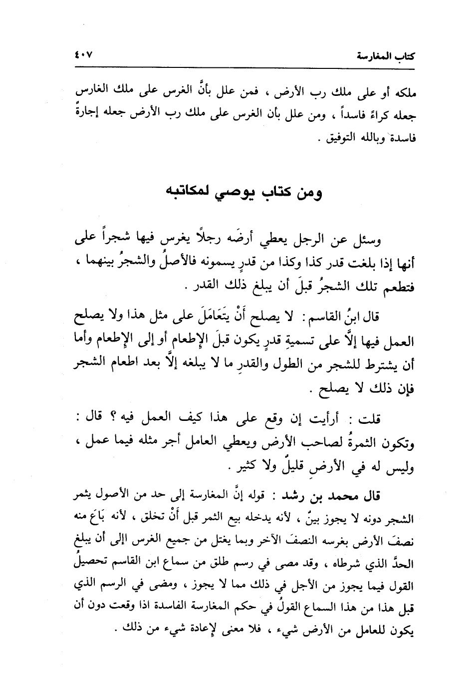 ومن كتاب يوصي لمكاتبه وسئل عن الرجل يعطي أرضه رجلا يغرس فيها شجرا على أنها إذا بلغت قدر كذا وكذا من قدر يسمونه فالأصل والشجر بينهما، فتطعم تلك الشجر قبل أن يبلغ ذلك القدر.