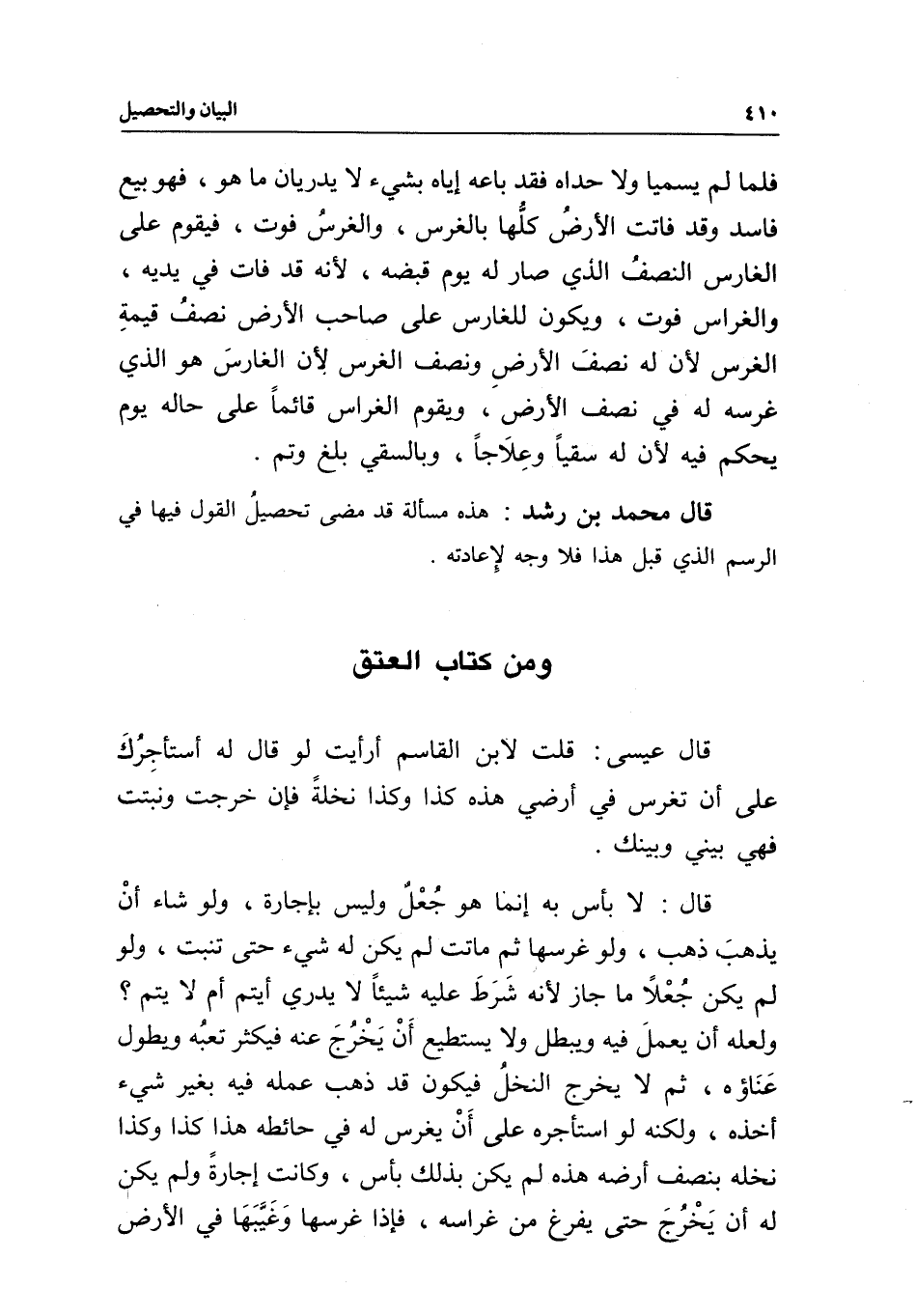 ومن كتاب العتق قال عيسى: قلت لابن القاسم أرأيت لو قال له أستأجرك على أن تغرس في أرضي هذه كذا وكذا نخلة، فإن خرجت ونبتت فهي بيني وبينك.