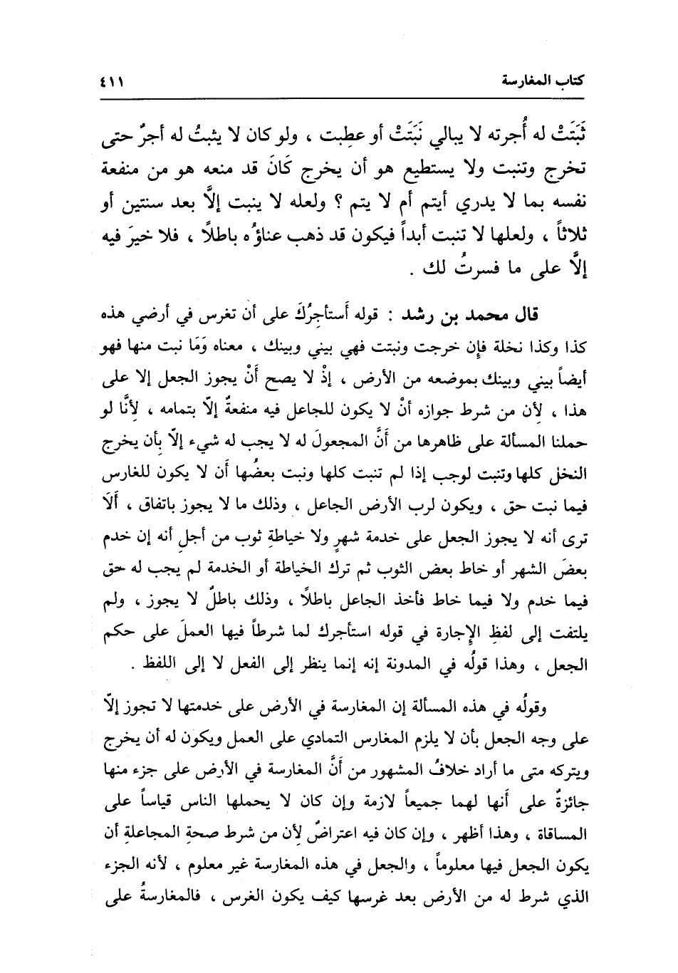 وقوله في هذه المسألة إن المغارسة في الأرض على خدمتها لا تجوز إلا على وجه الجعل بأن لا يلزم المغارس التمادي على العمل ويكون له أن يخرج ويتركه متى ما أراد خلاف المشهور من أن المغارسة في الأرض على جزء منها جائزة على أنها لهما جميعا لازمة وإن كان لا يحملها الناس قياسا على المساقاة، وهذا أظهر، وإن كان فيه اعتراض لأن من شرط صحة المجاعلة أن يكون الجعل فيها معلوما، والجعل في هذه المغارسة غير معلوم، لأنه الجزء الذي شرط له من الأرض بعد غرسها كيف يكون الغرس، فالمغارسة على