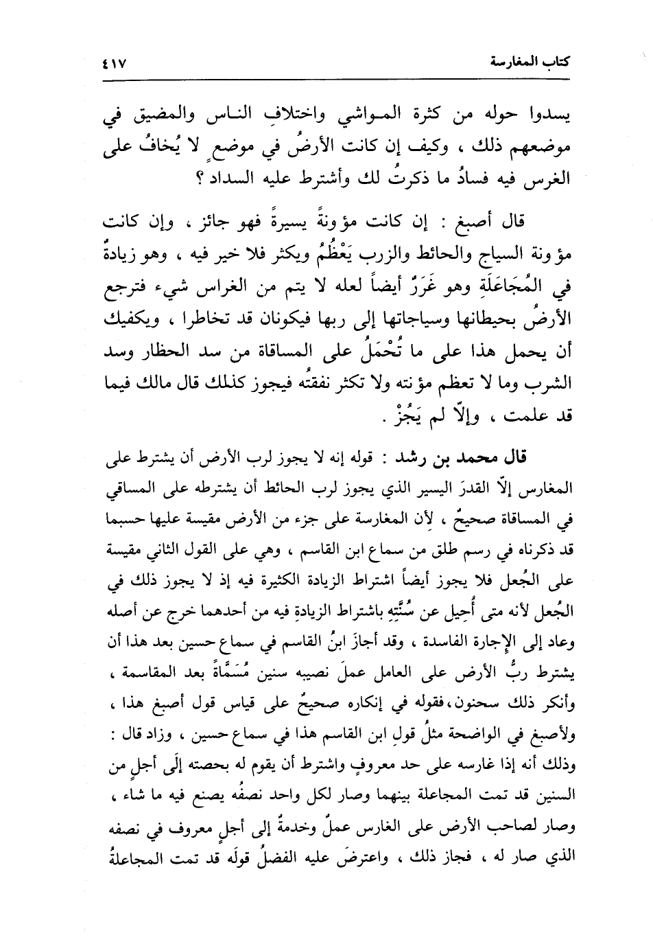 يسدوا حوله من كثرة المواشي واختلاف الناس والمضيق في موضعهم ذلك، وكيف إن كانت الأرض في موضع لا يخاف على الغرس فيه فساد ما ذكرت لك واشترط عليه السداد؟