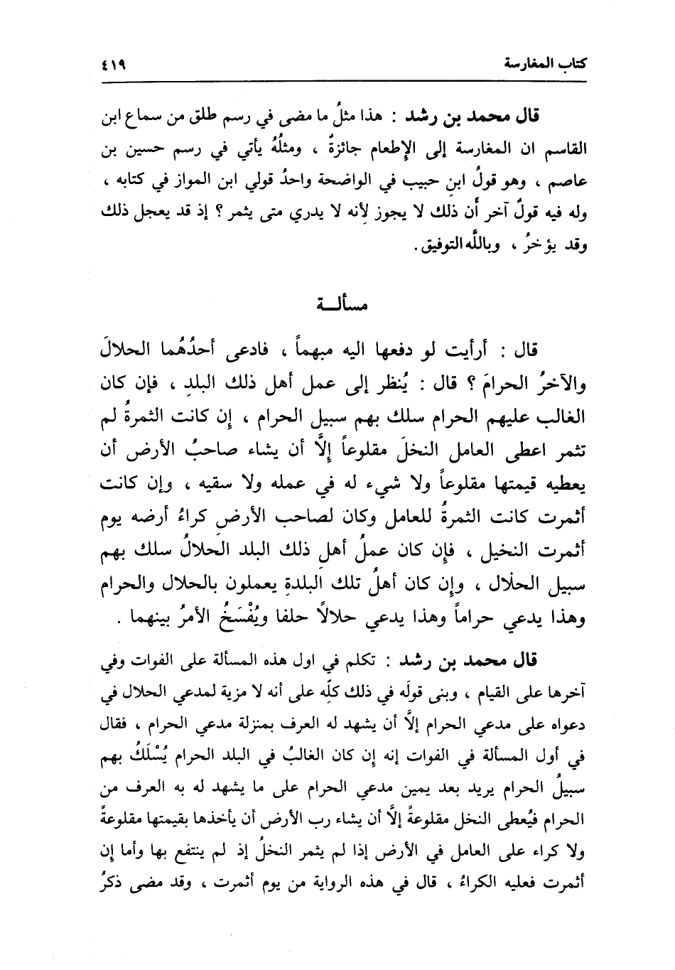 مسألة قال: أرأيت لو دفعها إليه مبهما، فادعى أحدهما الحلال والآخر الحرام؟ قال: ينظر إلى عمل أهل ذلك البلد، فإن كان الغالب عليهم الحرام سلك بهم سبيل الحرام، إن كانت الثمرة لم تثمر أعطى العامل النخل مقلوعا إلا أن يشاء صاحب الأرض أن يعطيه قيمتها مقلوعا ولا شيء له في عمله ولا سقيه، وإن كانت أثمرت كانت الثمرة للعامل وكان لصاحب الأرض كراء أرضه يوم أثمرت النخيل، فإن كان عمل أهل ذلك البلد الحلال سلك بهم سبيل الحلال، وإن كان أهل تلك البلدة يعملون بالحلال والحرام وهذا يدعي حراما وهذا يدعي حلالا حلفا ويفسخ الأمر بينهما.