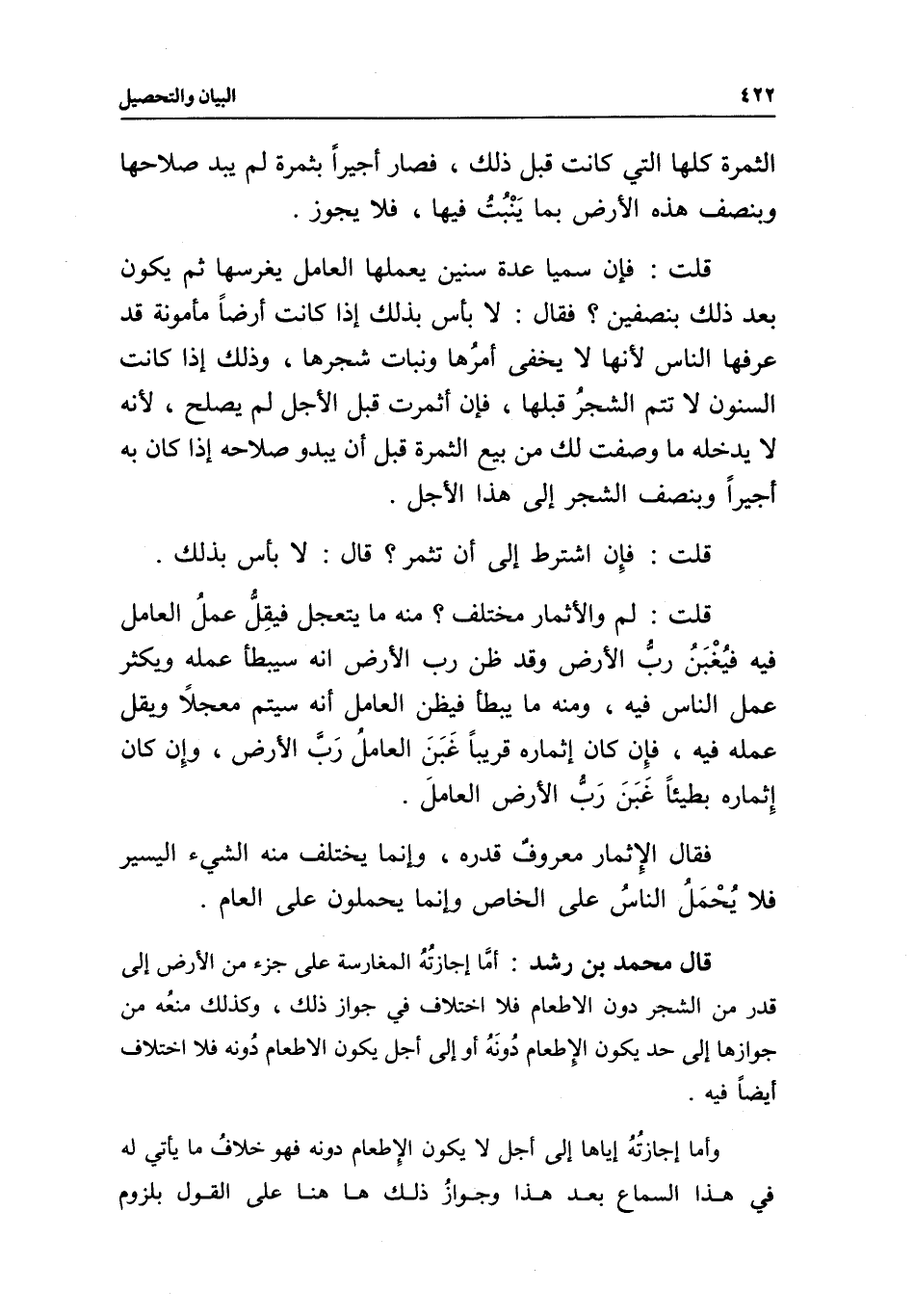 قلت: لم والإثمار مختلف؟ منه ما يتعجل فيقل عمل العامل فيه فيغبن رب الأرض وقد ظن رب الأرض أنه سيبطأ عمله ويكثر عمل الناس فيه، ومنه ما يبطأ فيظن العامل أنه سيتم معجلا ويقل عمله فيه، فإن كان إثماره قريبا غبن العامل رب الأرض، وإن كان إثماره بطيئا غبن رب الأرض العامل.