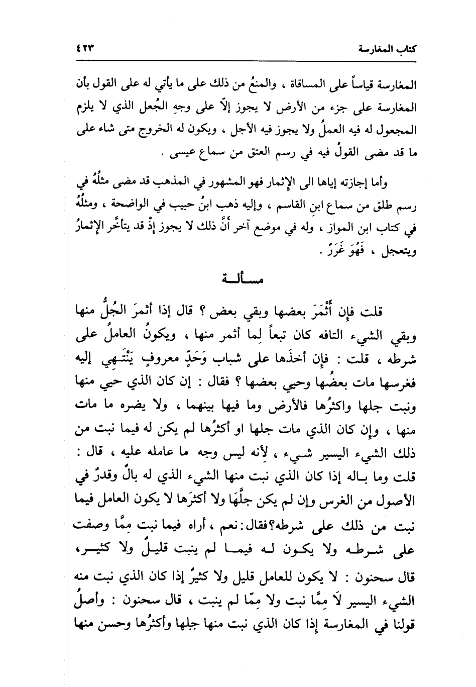 مسألة قلت فإن أثمر بعضها وبقي بعض؟ قال إذا أثمر الجل منها وبقي الشيء التافه كان تبعا لما أثمر منها، ويكون العامل على شرطه، قلت: فإن أخذها على شباب وحد معروف ينتهي إليه فغرسها مات بعضها وحيي بعضها؟ فقال: إن كان الذي حيي منها ونبت جلها وأكثرها فالأرض وما فيها بينهما، ولا يضره ما مات منها، وإن كان الذي مات جلها أو أكثرها لم يكن له فيما نبت من ذلك الشيء اليسير شيء، لأنه ليس وجه ما عامله عليه، قال: قلت وما باله إذا كان الذي نبت منها الشيء الذي له بال وقدر في الأصول من الغرس، وإن لم يكن جلها ولا أكثرها لا يكون العامل فيما نبت من ذلك على شرطه؟ فقال: نعم، أراه فيما نبت مما وصفت على شرطه ولا يكون له فيما لم ينبت قليل ولا كثير، قال سحنون: لا يكون للعامل قليل ولا كثير إذا كان الذي نبت منه الشيء اليسير لا مما نبت ولا مما لم ينبت، قال سحنون: وأصل قولنا في المغارسة إذا كان الذي نبت منها جلها وأكثرها وحسن منها
