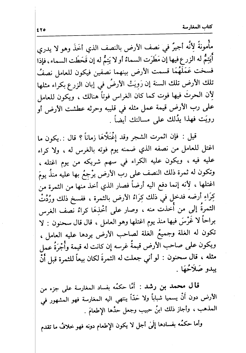 قال محمد بن رشد: أما حكمه بفساد المغارسة على جزء من الأرض دون أن يسميا شبابا ولا حدا ينتهي إليه المغارسة فهو المشهور في المذهب، وأجاز ذلك ابن حبيب وجعل حدها الإطعام.