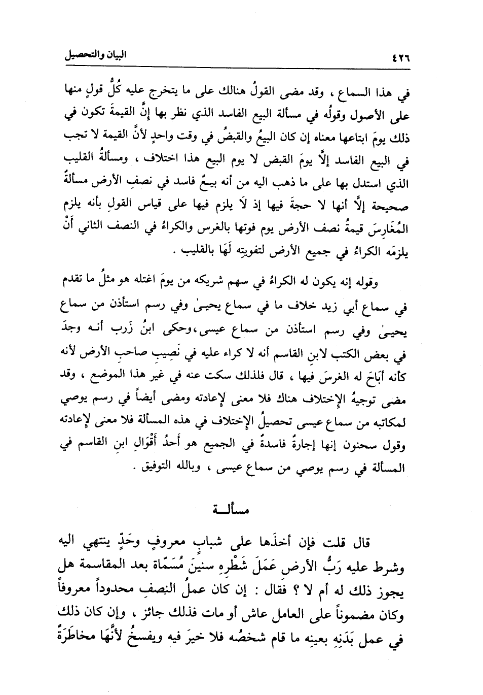 في هذا السماع، وقد مضى القول هنالك على ما يتخرج عليه كل قول منها على الأصول، وقوله في مسألة البيع الفاسد الذي نظر بها إن القيمة تكون في ذلك يوم ابتاعها، معناه إن كان البيع والقبض في وقت واحد؛ لأن القيمة لا تجب في البيع الفاسد إلا يوم القبض لا يوم البيع هذا اختلاف، ومسألة القليب الذي استدل بها على ما ذهب إليه من أنه بيع فاسد في نصف الأرض مسألة صحيحة إلا أنها لا حجة فيها إذ لا يلزم فيها على قياس القول بأنه يلزم المغارس قيمة نصف الأرض يوم فوتها بالغرس والكراء في النصف الثاني أن يلزمه الكراء في جميع الأرض لتفويته لها بالقليب.