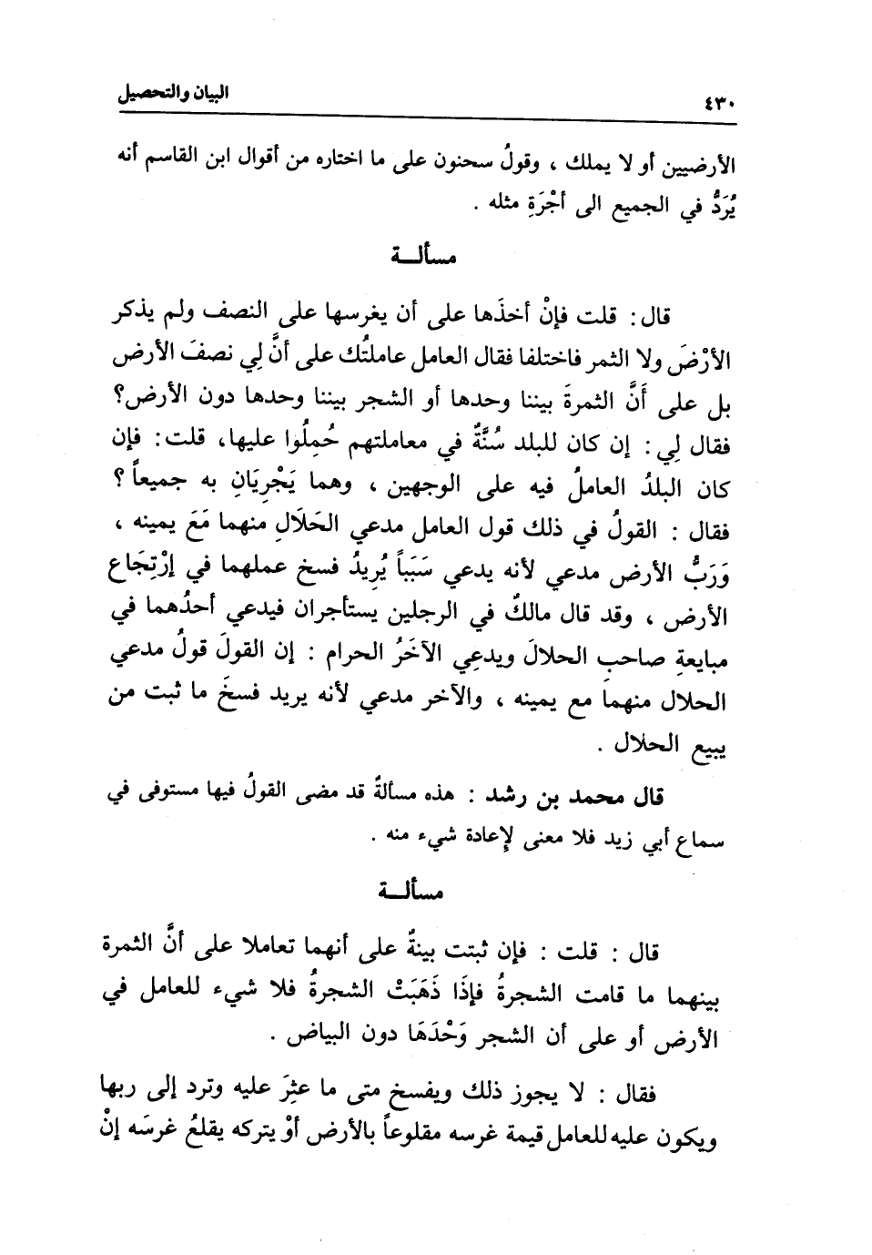 مسألة قال: قلت فإن أخذها على أن يغرسها على النصف ولم يذكر الأرض ولا الثمر فاختلفا فقال العامل عاملتك على أن لي نصف الأرض، بل على أن الثمرة بيننا وحدها أو الشجر بيننا وحدها دون الأرض؟ فقال لي: إن كان للبلد سنة في معاملتهم حملوا عليها، قلت: فإن كان البلد العامل فيه على الوجهين، وهما يجريان به جميعا؟ فقال: القول في ذلك قول العامل مدعي الحلال منهما مع يمينه، ورب الأرض مدعي لأنه يدعي سببا يريد فسخ عملهما في ارتجاع الأرض، وقد قال مالك في الرجلين يستأجران فيدعي أحدهما في مبايعة صاحب الحلال ويدعي الآخر الحرام: إن القول قول مدعي الحلال منهما مع يمينه، والآخر مدعي؛ لأنه يريد فسخ ما ثبت من يبيع الحلال.