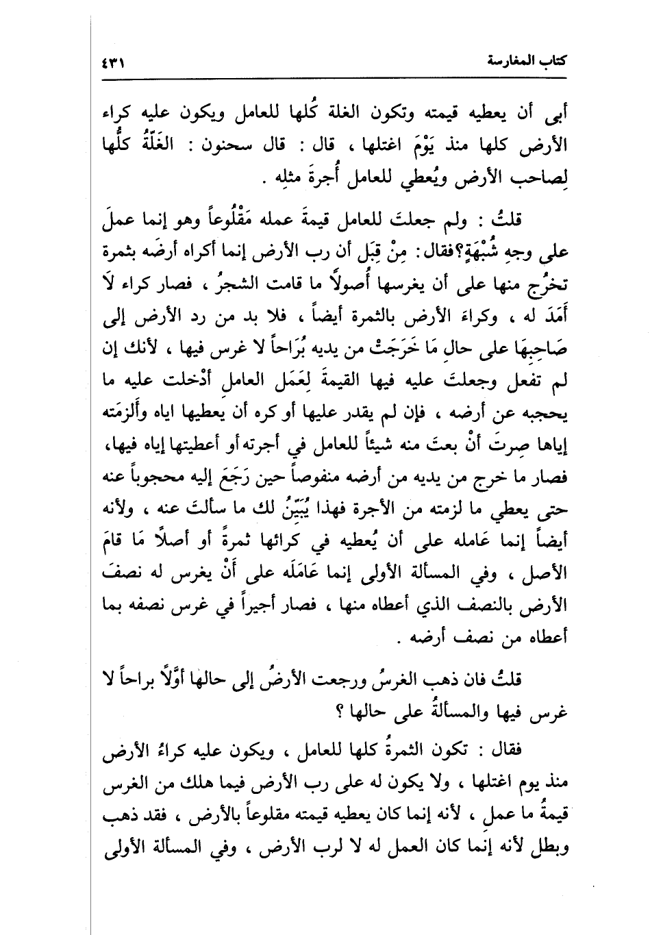 قلت: ولم جعلت للعامل قيمة عمله مقلوعا وهو إنما عمل على وجه شبهة؟ فقال: من قبل أن رب الأرض إنما أكراه أرضه بثمرة تخرج منها على أن يغرسها أصولا ما قامت الشجر، فصار كراء لا أمد له، وكراء الأرض بالثمرة أيضا، فلا بد من رد الأرض إلى صاحبها على حال ما خرجت من يديه براحا لا غرس فيها، لأنك إن لم تفعل وجعلت عليه فيها القيمة لعمل العامل أدخلت عليه ما يحجبه عن أرضه، فإن لم يقدر عليها أو كره أن يعطيها إياه وألزمته إياها صرت أن بعت منه شيئا للعامل في أجرته أو أعطيتها إياه فيها، فصار ما خرج من يديه من أرضه منفوصا حين رجع إليه محجوبا عنه حتى يعطي ما لزمته من الأجرة فهذا يبين لك ما سألت عنه، ولأنه أيضا إنما عامله على أن يعطيه في كرائها ثمرة أو أصلا ما قام الأصل، وفي المسألة الأولى إنما عامله على أن يغرس له نصف الأرض بالنصف الذي أعطاه منها، فصار أجيرا في غرس نصفه بما أعطاه من نصف أرضه.