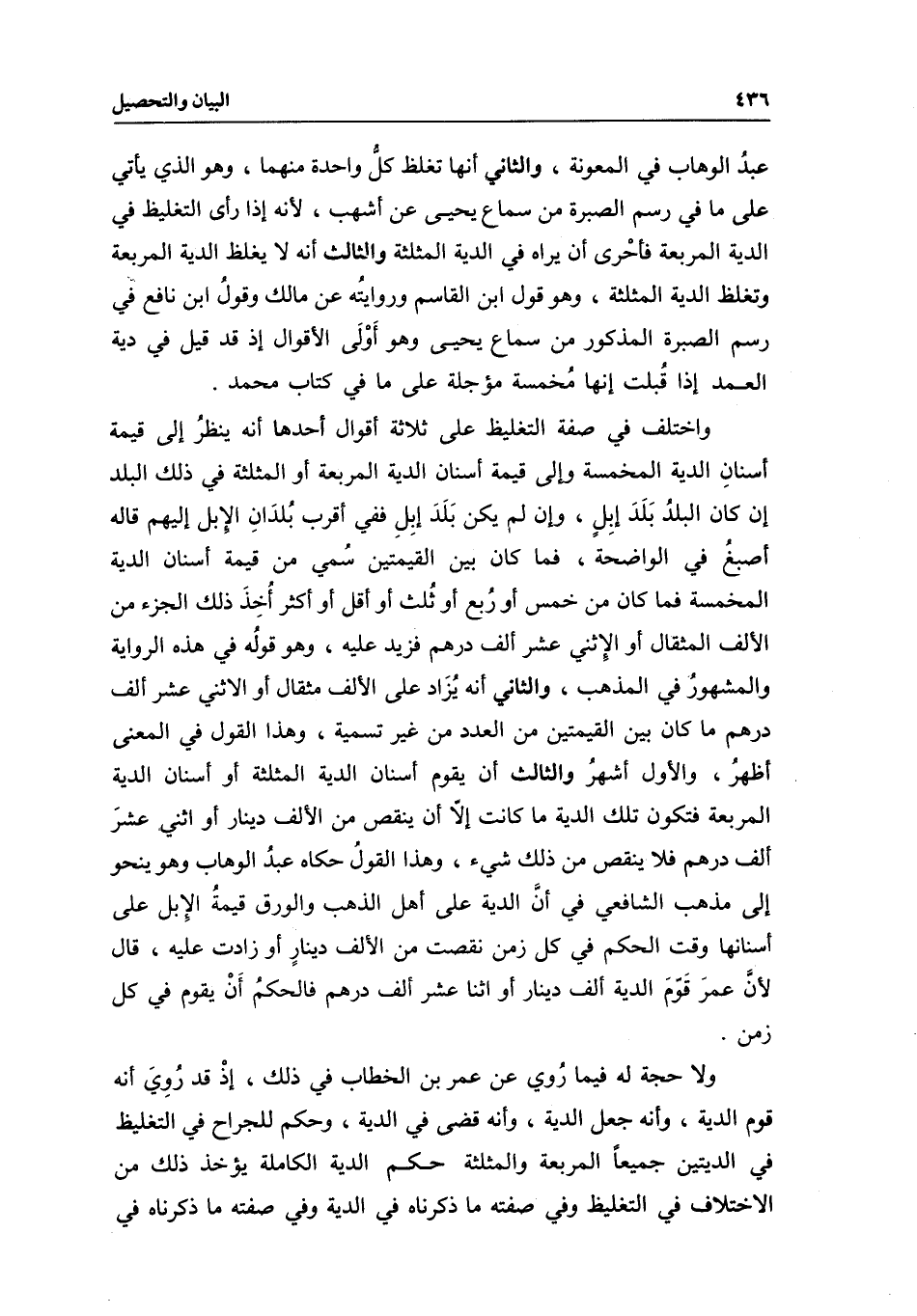 والثالث أن يقوم أسنان الدية المثلثة أو أسنان الدية المربعة فتكون تلك الدية ما كانت إلا أن ينقص من الألف دينار أو اثني عشر ألف درهم فلا ينقص من ذلك شيء، وهذا القول حكاه عبد الوهاب وهو ينحو إلى مذهب الشافعي في أن الدية على أهل الذهب والورق قيمة الإبل على أسنانها وقت الحكم في كل زمن نقصت من الألف دينار أو زادت عليه، قال: لأن عمر قوم الدية ألف دينار أو اثني عشر ألف درهم فالحكم أن يقوم في كل زمن.