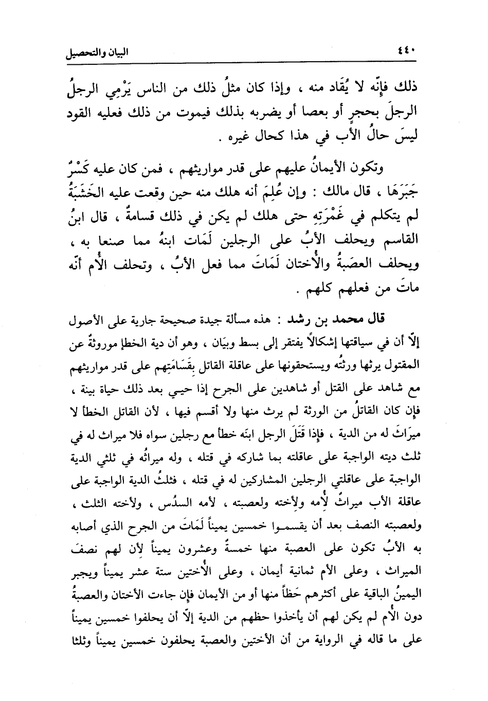 قال محمد بن رشد: هذه مسألة جيدة صحيحة جارية على الأصول إلا أن في سياقتها إشكالا يفتقر إلى بسط وبيان، وهو أن دية الخطأ موروثة عن المقتول يرثها ورثته وبستحقونها على عاقلة القاتل بقسامتهم على قدر مواريثهم مع شاهد على القتل أو شاهدين على الجرح إذا حيي بعد ذلك حياة بينة، فإن كان القاتل من الورثة لم يرث منها ولا أقسم فيها، لأن القاتل الخطأ لا ميراث له من لدية، فإذا قتل الرجل ابنه خطأ مع رجلين سواه فلا ميراث له في ثلث ديته الواجبة على عاقلته بما شاركه في قتله، وله ميراثه في ثلثي الدية الواجبة على عاقلتي الرجلين المشاركين له في قتله، فثلث الدية الواجبة على عاقلة الأب ميراث لأمه ولأخته ولعصبته، لأمه السدس، ولأخته الثلث، ولعصبته النصف بعد أن يقسموا خمسين يمينا لمات من الجرح الذي أصابه به الأب تكون على العصبة منها خمسة وعشرون يمينا لأن لهم نصف الميراث، وعلى الأم ثمانية أيمان، وعلى الأختين ستة عشر يمينا ويجبر اليمين الباقية على أكثرهم حظا منها أو من الأيمان فإن جاءت الأختان والعصبة دون الأم لم يكن لهم أن يأخذوا حظهم من الدية إلا أن يحلفوا خمسين يمينا على ما قاله في الرواية من أن الأختين والعصبة يحلفون خمسين يمينا وثلثا