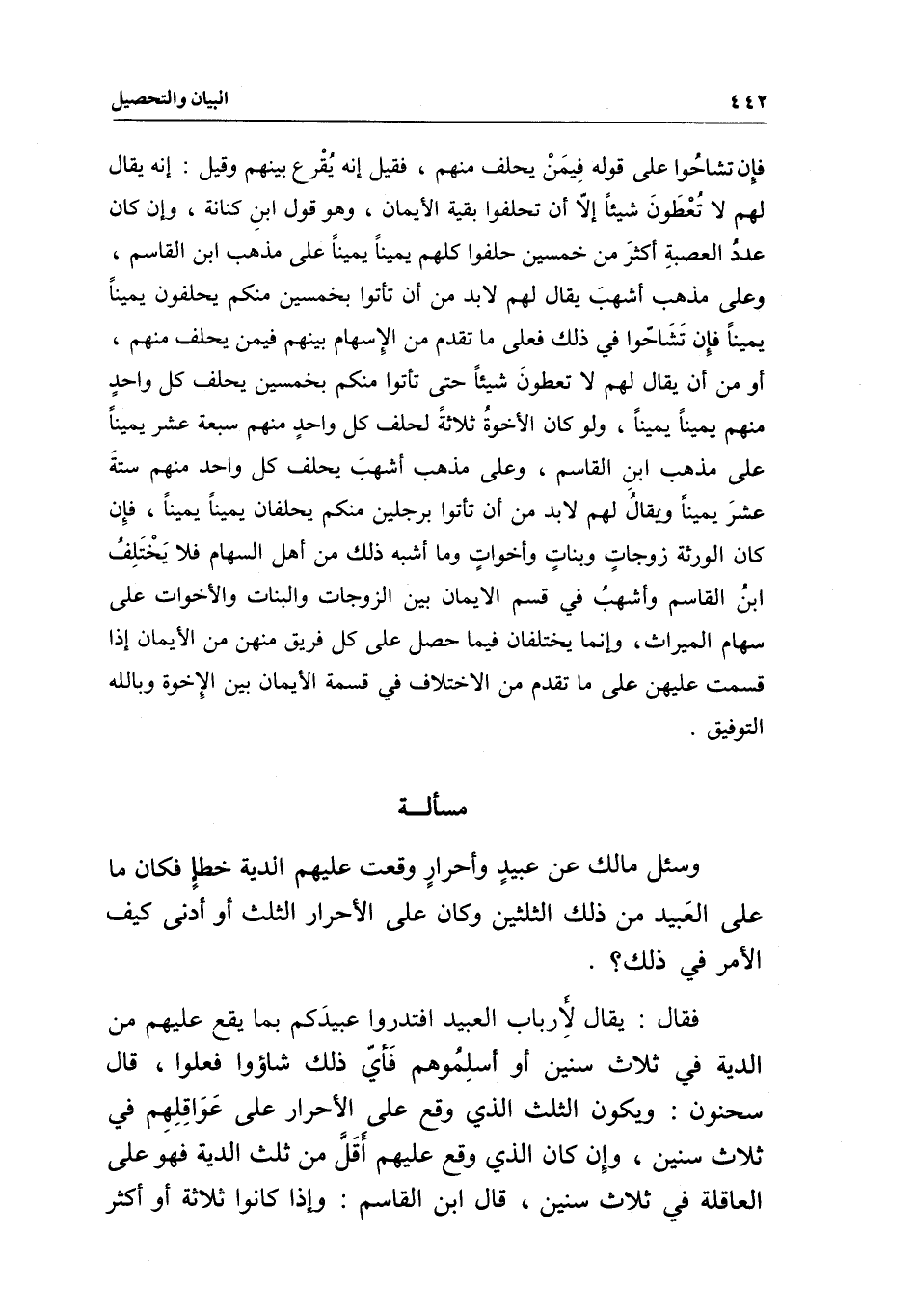 فإن تشاحوا على قوله فيمن يحلف منهم، فقيل: إنه يقرع بينهم وقيل: إنه يقال لهم لا تعطون شيئا إلا أن تحلفوا بقية الأيمان، وهو قول ابن كنانة، وإن كان عدد العصبة أكثر من خمسين حلفوا كلهم يمينا يمينا على مذهب ابن القاسم، وعلى مذهب أشهب يقال لهم: لا بد من أن تأتوا بخمسين منكم يحلفون يمينا يمينا فإن تشاحوا في ذلك فعلى ما تقدم من الإسهام بينهم فيمن يحلف منهم، أو من أن يقال لهم لا تعطون شيئا حتى تأتوا منكم بخمسين يحلف كل واحد منهم يمينا يمينا، ولو كان الأخوة ثلاثة لحلف كل واحد منهم سبعة عشر يمينا على مذهب ابن القاسم، وعلى مذهب أشهب يحلف كل واحد منهم ستة عشر يمينا، ويقال لهم: لا بد من أن تأتوا برجلين منكم يحلفان يمينا يمينا، فإن كان الورثة زوجات وبنات وأخوات وما أشبه ذلك من أهل السهام فلا يختلف ابن القاسم وأشهب في قسم الأيمان بين الزوجات والبنات والأخوات على سهام الميراث، وإنما يختلفان فيما حصل على كل فريق منهن من الأيمان إذا قسمت عليهن على ما تقدم من الاختلاف في قسمة الأيمان بين الإخوة وبالله التوفيق.