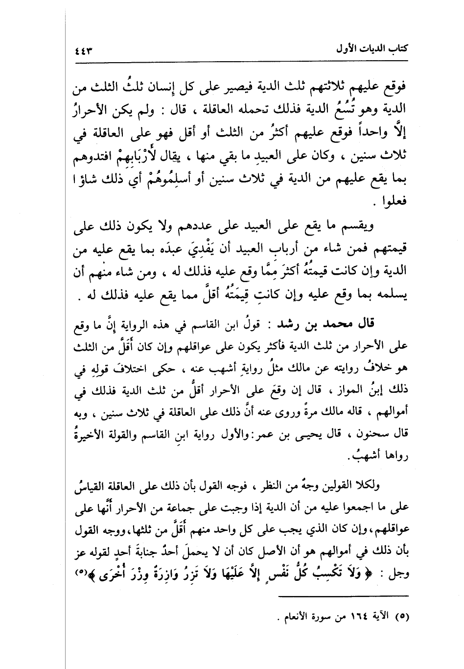 قال محمد بن رشد: قول ابن القاسم في هذه الرواية إن ما وقع على الأحرار من ثلث الدية فأكثر يكون على عواقلهم وإن كان أقل من الثلث هو خلاف روايته عن مالك مثل رواية أشهب عنه، حكى اختلاف قوله في ذلك ابن المواز، قال إن وقع على الأحرار أقل من ثلث الدية فذلك في أموالهم، قاله مالك مرة وروى عنه أن ذلك على العاقلة في ثلاث سنين، وبه قال سحنون، قال يحيى بن عمر: والأول رواية ابن القاسم والقولة الأخيرة رواها أشهب.