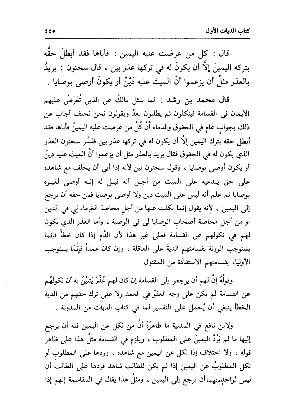 قال محمد بن رشد: لما سئل مالك عن الذين تعرض عليهم الأيمان في القسامة فينكلون ثم يطلبون بعد ويقولون نحن نحلف أجاب عن ذلك بجواب عام في الحقوق والدماء أن كل من عرضت عليه اليمين فأباها فقد أبطل حقه بترك اليمين إلا أن يكون له في تركها عذر بين ففسر سحنون العذر الذي يكون له في الحقوق فقال: يريد بالعذر مثل أن يزعموا أن الميت عليه دين أو يكون أوصى بوصايا، وقول سحنون بين لأنه إذا أبى أن يحلف مع شاهده على حق يدعيه على الميت من أجل أنه قيل له إنه أوصى لغيره بوصايا ثم علم أنه ليس على الميت دين ولا أوصى به بوصايا فمن حقه أن يرجع إلى اليمين، لأنه يقول: إنما نكلت عنها من أجل محاصة الغرماء لي في الدين أو من أجل محاصة أصحاب الوصايا لي في الوصية، وأما العذر الذي يكون لهم في نكولهم عن القسامة فعلى غير هذا لأن الدم إذا كان خطأ فإنما يستوجب الورثة بقسامتهم الدية على العاقلة، وإن كان عمدا فإنما يستوجب الأولياء بقسامتهم الاستقادة من المقتول.