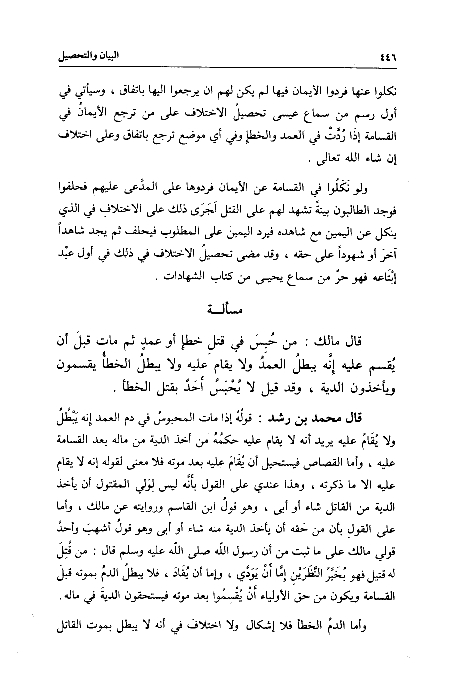 قال محمد بن رشد: قوله إذا مات المحبوس في دم العمد إنه يبطل ولا يقام عليه يريد أنه لا يقام عليه حكمه من أخذ الدية من ماله بعد القسامة عليه، وأما القصاص فيستحيل أن يقام عليه بعد موته فلا معنى لقوله إنه لا يقام عليه إلا ما ذكرته، وهذا عندي على القول بأنه ليس لولي المقتول أن يأخذ الدية من القاتل شاء أو أبى، وهو قول ابن القاسم وروايته عن مالك، وأما على القول بأن من حقه أن يأخذ الدية منه شاء أو أبى وهو قول أشهب وأحد قولي مالك على ما ثبت من أن رسول الله - صَلَّى اللَّهُ عَلَيْهِ وَسَلَّمَ - قال: «من قتل له قتيل فهو بخير النظرين إما أن يودي، وإما أن يقاد» فلا يبطل الدم بموته قبل القسامة ويكون من حق الأولياء أن يقسموا بعد موته فيستحقون الدية في ماله.