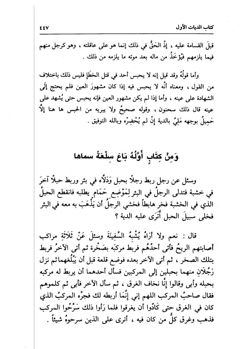 ومن كتاب أوله باع سلعة سماها وسئل عن رجل ربط رجلا بحبل ودلاه في بئر وربط حبلا آخر في خشبة فتدلى الرجل في البئر لموضع حمام يطلبه فانقطع الحبل الذي في الخشبة فخر هابطا فخشي الرجل أن يذهب به معه في البئر فخلى سبيل الحبل أترى عليه الدية؟