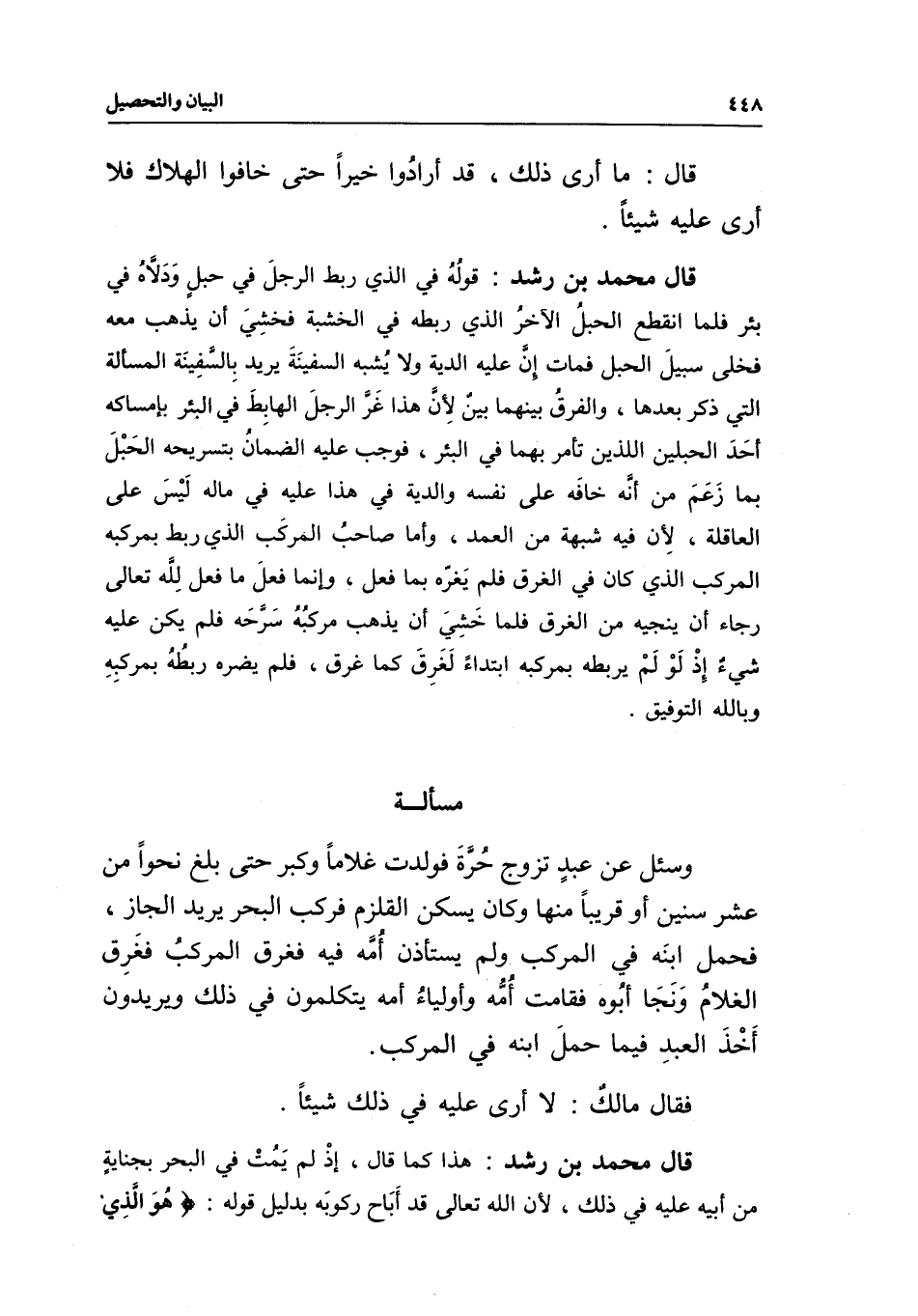 قال محمد بن رشد: قوله في الذي ربط الرجل في حبل ودلاه في بئر فلما انقطع الحبل الآخر الذي ربطه في الخشبة فخشي أن يذهب معه فخلى سبيل الحبل فمات؛ إن عليه الدية ولا يشبه السفينة يريد بالسفينة المسألة التي ذكر بعدها، والفرق بينهما بين لأن هذا غر الرجل الهابط في البئر بإمساكه أحد الحبلين اللذين تأمر بهما في البئر، فوجب عليه الضمان بتسريحه الحبل بما زعم من أنه خافه على نفسه والدية في هذا عليه في ماله ليس على العاقلة، لأن فيه شبهة من العمد، وأما صاحب المركب الذي ربط بمركبه المركب الذي كان في الغرق فلم يغره بما فعل، وإنما فعل ما فعل لله تعالى رجاء أن ينجيه من الغرق فلما خشي أن يذهب مركبه سرحه فلم يكن عليه شيء إذ لو لم يربطه بمركبه ابتداء لغرق كما غرق، فلم يضره ربطه بمركبه وبالله التوفيق.